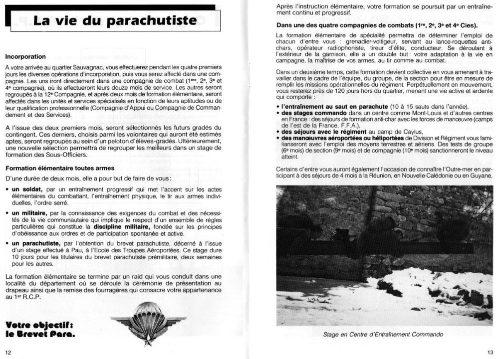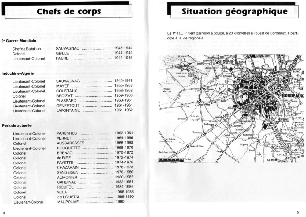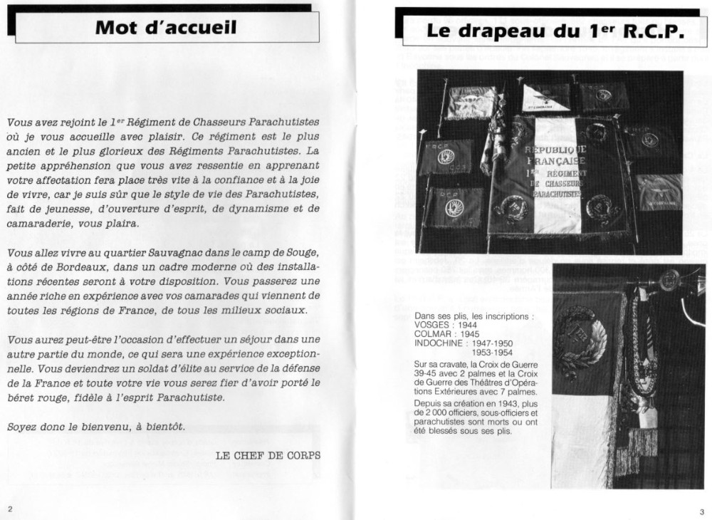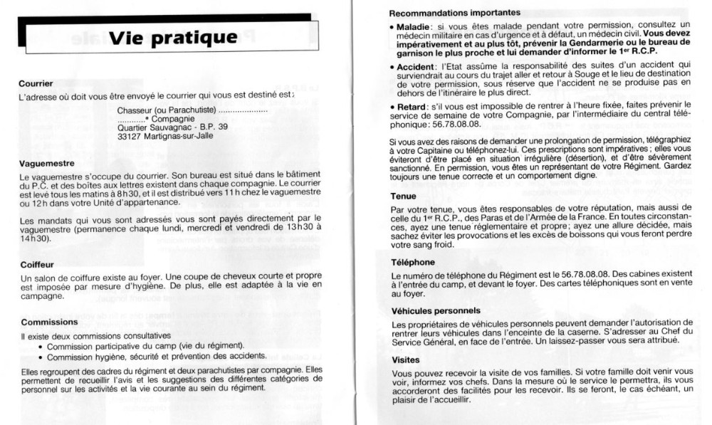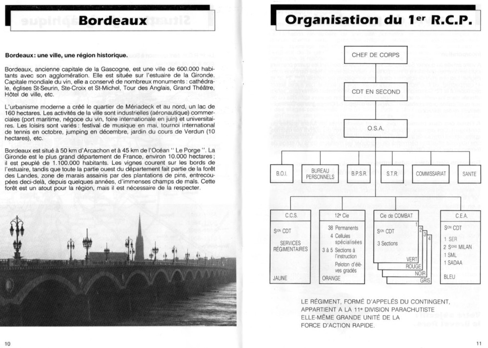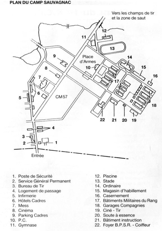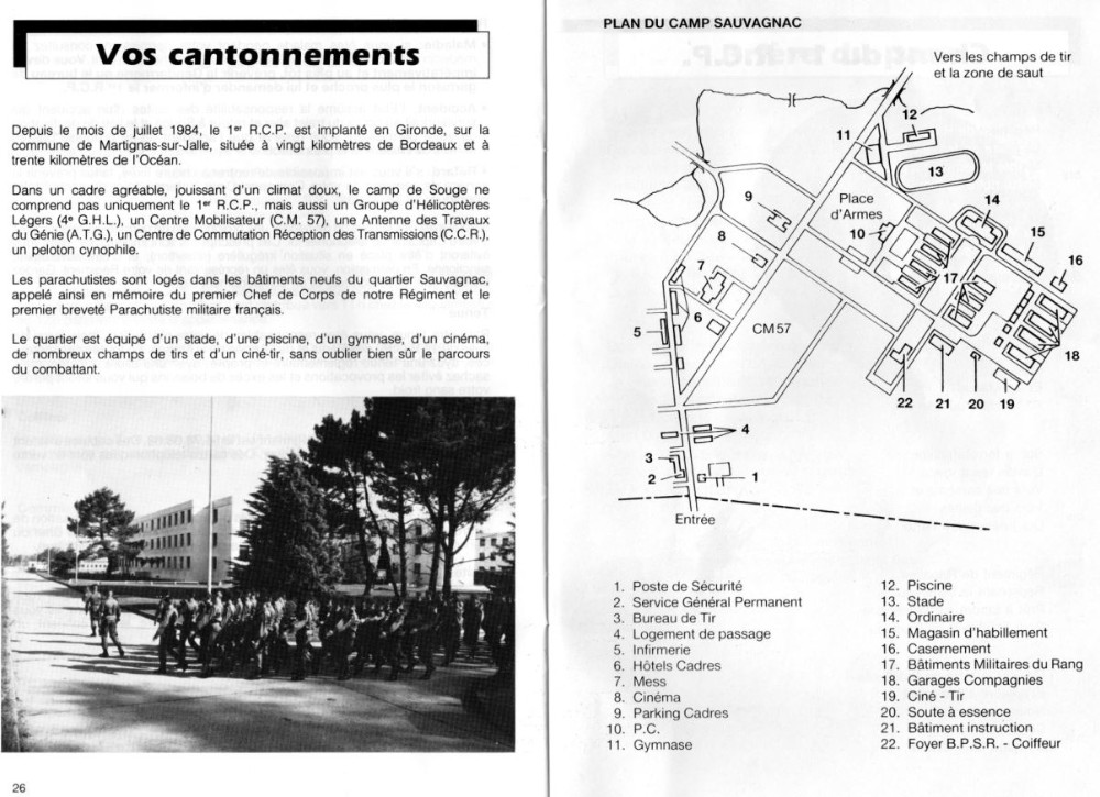 ► LE CAMP de SOUGE ( 1984-1999 ) Le 1° R.C.P. et le CAMP d' IDRON ( Décembre 1962 - Juillet 1984 ) Nous avons largement témoigné de cette époque des Appelés Volontaires Parachutistes du temps de paix .Une sorte de Désert des Tartares émaillé d'exercices GUEPARD et de Compagnies Tournantes en renforcement des unités stationnées outre mer . Les anciens sont profondément attachés au cadre de vie qu'offrait le CAMP d' IDRON avec ses chalets de Section au sein d' un ensemble spécifique à chaque Compagnie . Au dela des questions sentimentales la situation du CAMP d' IDRON ,totalement enclavé , cerné par la construction de lotissements chaque jour plus envahissants,devenait intenable .La circulation automobile rendait dangereux les itinéraires de footing, le stand de tir était condamné pour cause de nuisance sonore , la motorisation annoncée du Régiment ( VAB) n' était guère réalisable dans ce type de cantonnement ...En outre le casernement d'un autre âge était vraiment parvenu au terme de l' acceptable . Un ensemble moderne était vacant dans la région de BORDEAUX il a bien fallu se résoudre au départ . C' est le Colonel JC CARDINAL qui fermera IDRON et ouvrira l'ère SOUGE. Le 1°R.C.P. et le CAMP de SOUGE (Juillet 1984- Juillet 1999) Cette époque fut celle des Appelés Volontaires Parachutistes au sein de ce que l'on a pu appeler "l'âge d' or de la Force d' Action Rapide -FAR- "L' attentat du DRAKKAR - 23 Octobre 1983 - marque la transition entre les époques CAMP d' IDRON et CAMP de SOUGE . Le CAMP d' IDRON avait vu le départ du Régiment des derniers anciens d' INDOCHINE, le CAMP de SOUGE verra le départ des derniers anciens d' ALGERIE . C' est le lieutenant Colonel Philippe LECLERE qui fermera SOUGE mais n' aura pas le plaisir d'inaugurer PAMIERS garnison du 9° R.C.P. les années se sont écoulées depuis le départ du 1° RCP du CAMP de SOUGE, il nous est apparu nécessaire de témoigner des quinze années passées au CAMP de SOUGE, d'autant que nous avons largement évoqué les années IDRON/GER .Nous savons aussi que les anciens du CAMP de SOUGE attendent que ce nouveau chapitre de la vie du 1° RCP soit ouvert . cliquez sur les photos pour les agrandir " Ces deux vues montrent le CAMP de SOUGE dans son ensemble .Le 1° RCP n'y sera pas seul Il partagera l' espace avec un Centre mobilisateur (CM 57 ) et un Détachement de l' ALAT " " Ce plan tiré du livret d' accueil permettra aux visiteurs du site de mieux interpréter les photos aériennes " GUIDE d' ACCUEIL du 1° R.C.P. au CAMP de SOUGE ( édition de 1991 ) Le livret d' accueil, ici nommé Guide d' accueil ,que reçoit chaque Chasseur Parachutiste lors de son incorporation offre un panorama assez complet du quotidien de l' A.V.P. du 1° R.C.P. au Camp de SOUGE . " Photo de couverture du guide d' accueil " Toutes les photos de la période du Camp de SOUGE sont dues au talent de Michel BERNATETS ( voir au sujet de cet ancien AVP du 1° RCP : Mémoire d' ancien ) " Il est créé un INSIGNE spécial destiné à rappeler d'une façon permanente les actions d' éclat de certains régiments et unités formant corps cités à l' ordre de l' armée. Cet INSIGNE sera constitué par une fourragère aux couleurs de la croix de guerre .(circulaire de création en date du 21 avril 1916) La fourragère en terme de symbolique et de terminologie militaire est un INSIGNE et non pas une distinction honorifique .Ce type d' erreur est hélas fréquent dans les documents officiels " " Cette organisation du commandement du 1° RCP suggère une subordination verticale ,ce qui est faux .Le chef de corps exerce son commandement dans deux directions d'une part sur les commandants d'unités, d' autre part sur l' état major et les bureaux spécialisés , ces derniers n' ayant pas autorité sur les commandants d'unité ainsi que ce croquis pourrait le laissez entendre ." " militaire , soldat , parachutiste ....l' emploi de ces mots relève de la sémantique ou de l'usage du moment dans l'unité concernée .On pourrait penser que parachutiste est un sous ensemble de soldat qui lui mème est un sous ensemble de militaire .Je vois beaucoup de soldats mais peu de guerriers ( Ainsi parlait ZARATOUSTRA) ajoute un sous ensemble à soldat Dans cet exposé sur le Formation élémentaire toutes armes , on voit mal ce qui distingue le soldat du militaire ." " SER est interprèté comme Section d' Éclairage et de "Reconnaissance" ou de Renseignement " selon les pages du guide "