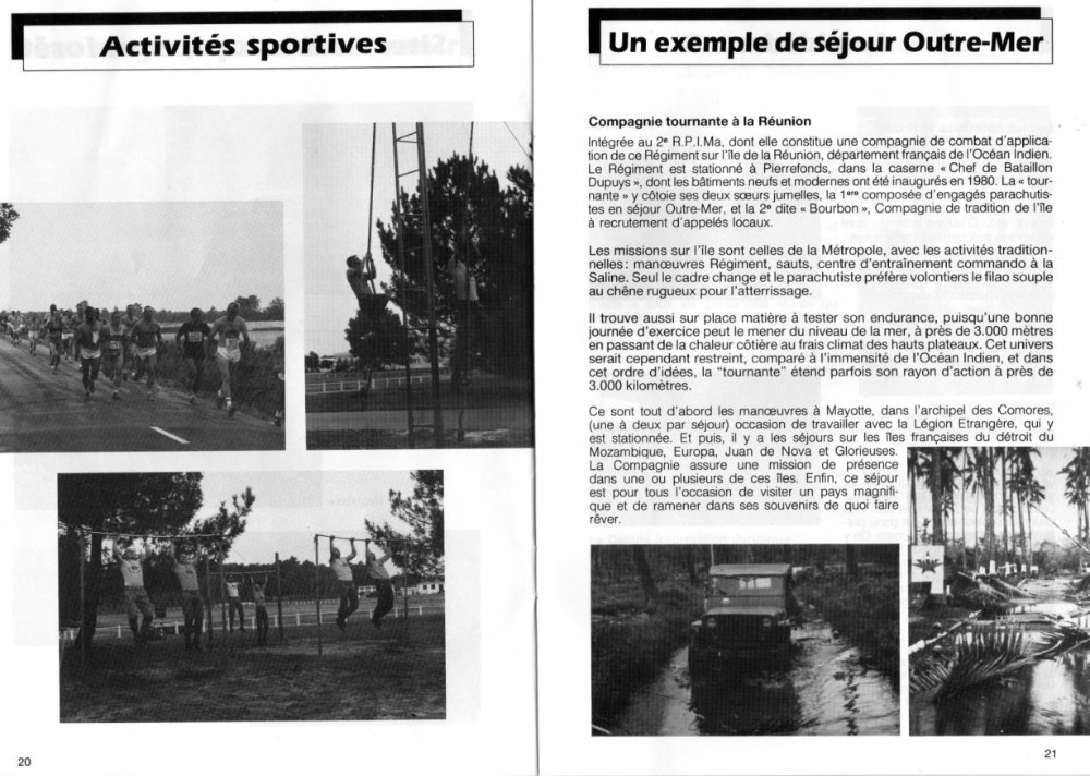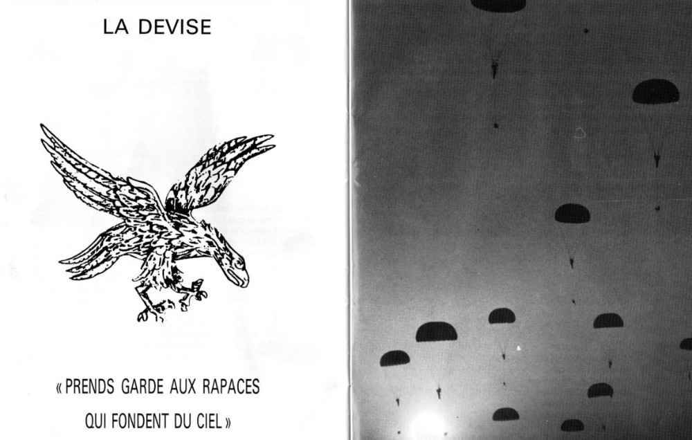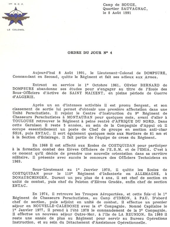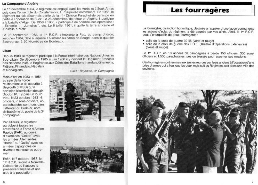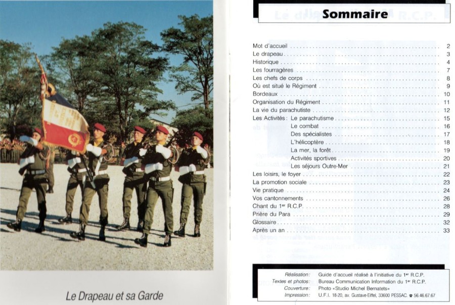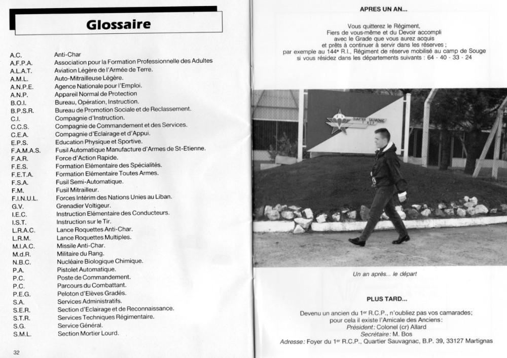 ► LE CAMP de SOUGE ( 1984-1999 ) Le 1° R.C.P. et le CAMP d' IDRON ( Décembre 1962 - Juillet 1984 ) Nous avons largement témoigné de cette époque des Appelés Volontaires Parachutistes du temps de paix .Une sorte de Désert des Tartares émaillé d'exercices GUEPARD et de Compagnies Tournantes en renforcement des unités stationnées outre mer . Les anciens sont profondément attachés au cadre de vie qu'offrait le CAMP d' IDRON avec ses chalets de Section au sein d' un ensemble spécifique à chaque Compagnie . Au dela des questions sentimentales la situation du CAMP d' IDRON ,totalement enclavé , cerné par la construction de lotissements chaque jour plus envahissants,devenait intenable .La circulation automobile rendait dangereux les itinéraires de footing, le stand de tir était condamné pour cause de nuisance sonore , la motorisation annoncée du Régiment ( VAB) n' était guère réalisable dans ce type de cantonnement ...En outre le casernement d'un autre âge était vraiment parvenu au terme de l' acceptable . Un ensemble moderne était vacant dans la région de BORDEAUX il a bien fallu se résoudre au départ . C' est le Colonel JC CARDINAL qui fermera IDRON et ouvrira l'ère SOUGE. Le 1°R.C.P. et le CAMP de SOUGE (Juillet 1984- Juillet 1999) Cette époque fut celle des Appelés Volontaires Parachutistes au sein de ce que l'on a pu appeler "l'âge d' or de la Force d' Action Rapide -FAR- "L' attentat du DRAKKAR - 23 Octobre 1983 - marque la transition entre les époques CAMP d' IDRON et CAMP de SOUGE . Le CAMP d' IDRON avait vu le départ du Régiment des derniers anciens d' INDOCHINE, le CAMP de SOUGE verra le départ des derniers anciens d' ALGERIE . C' est le lieutenant Colonel Philippe LECLERE qui fermera SOUGE mais n' aura pas le plaisir d'inaugurer PAMIERS garnison du 9° R.C.P. les années se sont écoulées depuis le départ du 1° RCP du CAMP de SOUGE, il nous est apparu nécessaire de témoigner des quinze années passées au CAMP de SOUGE, d'autant que nous avons largement évoqué les années IDRON/GER .Nous savons aussi que les anciens du CAMP de SOUGE attendent que ce nouveau chapitre de la vie du 1° RCP soit ouvert . cliquez sur les photos pour les agrandir " Ces deux vues montrent le CAMP de SOUGE dans son ensemble .Le 1° RCP n'y sera pas seul Il partagera l' espace avec un Centre mobilisateur (CM 57 ) et un Détachement de l' ALAT " " Ce plan tiré du livret d' accueil permettra aux visiteurs du site de mieux interpréter les photos aériennes " GUIDE d' ACCUEIL du 1° R.C.P. au CAMP de SOUGE ( édition de 1991 ) Le livret d' accueil, ici nommé Guide d' accueil ,que reçoit chaque Chasseur Parachutiste lors de son incorporation offre un panorama assez complet du quotidien de l' A.V.P. du 1° R.C.P. au Camp de SOUGE . " Photo de couverture du guide d' accueil " Toutes les photos de la période du Camp de SOUGE sont dues au talent de Michel BERNATETS ( voir au sujet de cet ancien AVP du 1° RCP : Mémoire d' ancien ) " Il est créé un INSIGNE spécial destiné à rappeler d'une façon permanente les actions d' éclat de certains régiments et unités formant corps cités à l' ordre de l' armée. Cet INSIGNE sera constitué par une fourragère aux couleurs de la croix de guerre .(circulaire de création en date du 21 avril 1916) La fourragère en terme de symbolique et de terminologie militaire est un INSIGNE et non pas une distinction honorifique .Ce type d' erreur est hélas fréquent dans les documents officiels " " Cette organisation du commandement du 1° RCP suggère une subordination verticale ,ce qui est faux .Le chef de corps exerce son commandement dans deux directions d'une part sur les commandants d'unités, d' autre part sur l' état major et les bureaux spécialisés , ces derniers n' ayant pas autorité sur les commandants d'unité ainsi que ce croquis pourrait le laissez entendre ." " militaire , soldat , parachutiste ....l' emploi de ces mots relève de la sémantique ou de l'usage du moment dans l'unité concernée .On pourrait penser que parachutiste est un sous ensemble de soldat qui lui mème est un sous ensemble de militaire .Je vois beaucoup de soldats mais peu de guerriers ( Ainsi parlait ZARATOUSTRA) ajoute un sous ensemble à soldat Dans cet exposé sur le Formation élémentaire toutes armes , on voit mal ce qui distingue le soldat du militaire ." " SER est interprèté comme Section d' Éclairage et de "Reconnaissance" ou de Renseignement " selon les pages du guide "