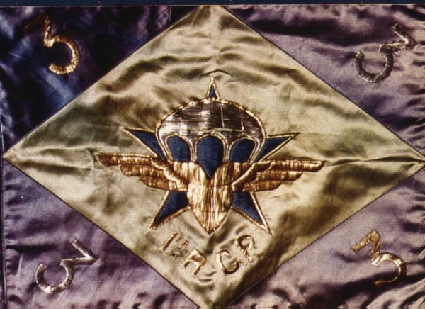 Avers du Fanion de Tradition confectionné en 1947 par des religieuses d'Hanoï d'après un dessin du Lieutenant ? , insigne du 1er RCP sur fond vert. Les angles frappés en 1 et 3 du 3 doré , et en 2 et 4 du 3 argenté identifiant la compagnie.