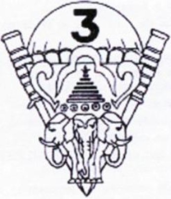 Insigne de la 3eme compagnie du 1er R.C.P. : Le parachute est bien évidement le lien avec les T.A.P. le chiffre noir est là pour rappeler la couleur de la compagnie. En haut des sept marche il y a une fleur de lys, qui est en quelque sorte un clin d'oeil à la succession de 3 capitaines à la tête de la compagnie dont le nom commençait par de... de Warren . de Fritsch . de Badts. la forme en triangle est pour ne pas ressembler aux autres insignes. En motif central c'est la reproduction du Fanion de Tradition. Les 2 poignards US sont particulièrement chargés d'anecdotes à la 3eme compagnie. L'insigne a été conçu par le Capitaine de Badts et dessiné par le Caporal/Chef Estival en 1976. Non homologué cet insigne a été tiré à 1000 exemplaires dont la moitié numéroté. Il est en métal argenté. L'insigne tissu à un fond jaune, couleur réglementaire de la 3 , jamais porté, formant avec la bordure bleue les couleurs du régiment. Motif central vert , éléphants blanc coiffés de rouge, marches blanches, fleur de lys bleue, le chiffre 3 en noir.