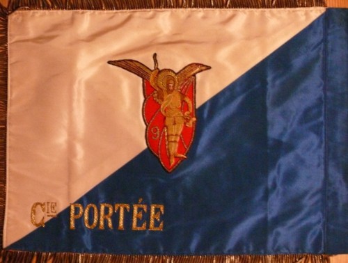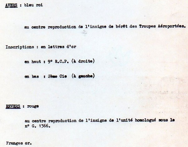 " Fanion de la C.P. couleur distinctive BLANCHE .Unité motorisée la C.P. présente un Fanion aux couleurs agencées en mode Tranché " CHANT 9° RCP Tous ces Fanions de la CCS , 1° ,2°, 3° Compagnies de la CA et de la CP sont parfaitement neufs ,ils n'ont visiblement jamais été mis en service . Fabriqués au même moment et par le même atelier ils sont de belle facture .Le Brevet de Parachutiste et l'insigne régimentaire qui les ornent sont magnifiques . Ils ont en commun des inscriptions réduites , en abrégé : I° Cie pour 1° COMPAGNIE , 9° R.C.P. pour 9° REGIMENT de CHASSEURS PARACHUTISTES par exemple . Il manque le Fanion de la 4° Compagnie pour que soient représentées toutes les Compagnies du 9° en AFN . D' après nos informations ce Fanion serait celui symboliquement utilisé par le Capitaine G.BUCHOUD ( 1981 - 1982 ) quand il commandait la 4° Compagnie Nous avons de bonnes raisons de penser que cette série de fanions a été offerte au Colonel P. BUCHOUD premier Chef de Corps du Régiment qui jouissait d'un prestige inégalé . Pourquoi ne sont ils pas l' exacte reproduction des Fanions remis aux unités le 11 Novembre 1956 ? Cette question n' aura probablement jamais de réponse . Jusque' en 1973 , date de création des Fanions de "3° type" les Compagnies seront dotés de Fanions du " 2° type" ou inspirés de ce "2° type" Il arrivera même qu' au delà de 1973 des Capitaines se voient offrir à l'issue de leur commandement des Fanions de "2° type" jugés plus représentatifs ,alors que pendant deux ans , sur les rangs de leur compagnie aura figuré un Fanion de "3° type " ....Ce genre de coquetterie se retrouve dans tous les régiments .Il traduit une forme de respect des anciens et d' idéalisation du passé . " Ce Fanion de la 2° Compagnie date très certainement des années 70/ 80 .Il est rectangulaire et frangé or Il est manifestement du "2° type" Les couleurs altérées par la lumière beaucoup plus que par un long usage sont le BLEU clair ( au lieu du BLEU roi ) à la hampe et le NOIR pour les parties flottantes . Il aurait du être ROUGE pour les parties flottantes Cependant après le retour d' ALGÉRIE l'indicatif de la 2° n' étant plus AMARANTE mais NOIR ..Le passant compagnie , le foulard d'identification de la compagnie , l'indicatif radio de la compagnie étant NOIR , certains capitaines ont fait réaliser des Fanions à la nouvelle couleur de la 2° : NOIR "