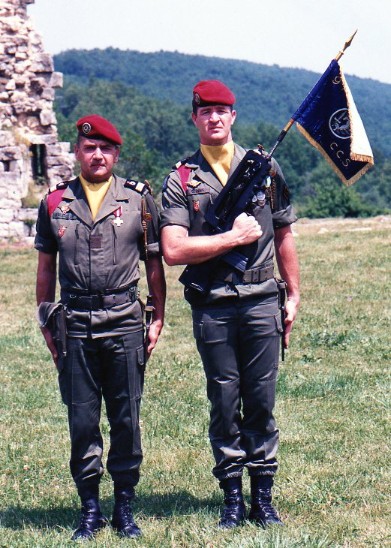 " Le Capitaine BERSILLON Commandant de Compagnie avec le Sergent Chef GERVAIS Porte Fanion de la C.C.S. Les foulards d'identification sont CARMIN indicatif de la C.C.S. " " Dossier d' homologation du Fanion de la 1° Compagnie sous le numéro G: 1982 "