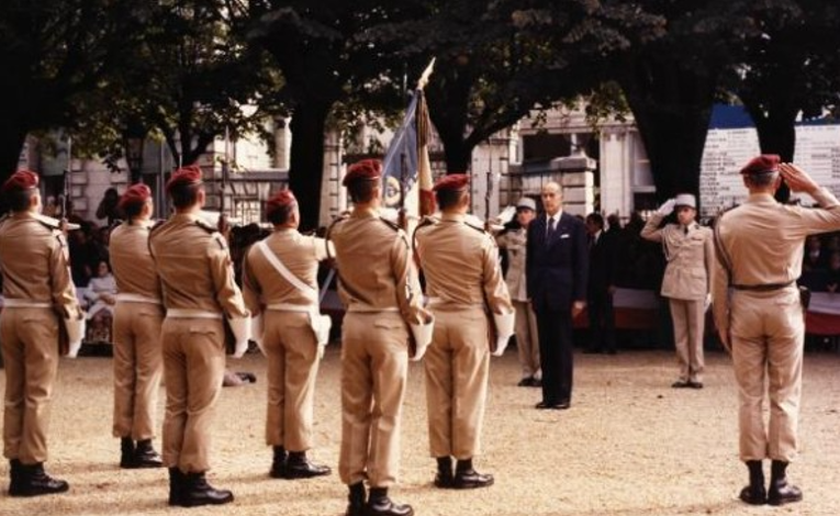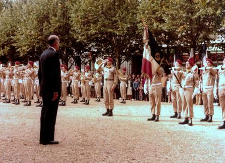 Le Président de la République, monsieur Giscard d'Estaing salue le Drapeau du 1° RCP, Chef de Corps Colonel Sengeisen. A gauche la Musique de la 11eme Division Parachutiste qui était basée au Camp d'Idron.