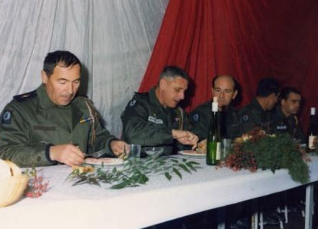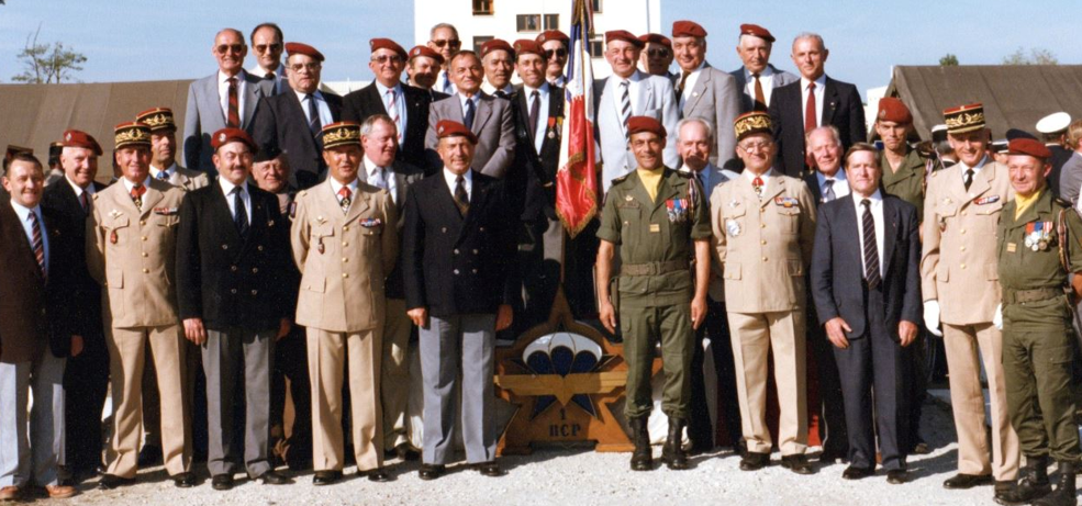 " Passation de Commandement entre le Colonel RIOUFOL, quittant et le Colonel VOLA prenant. été 1986 au Quartier SAUVAGNAC (Camp de SOUGE) Sept Chefs de Corps du 1° R.C.P. étaient présents pour l'occasion.