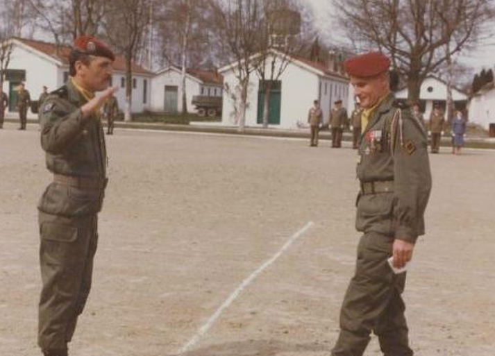 Inspection du Général LACAZE commandant de la 11eme Division Parachutiste en 1980 en conversation avec le Chef de Musique Monsieur de Courregelongue.