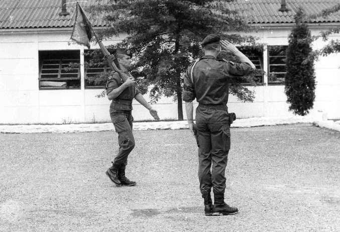 Le nouveau Commandant de Compagnie salue le Fanion des NOIRS. Porte Fanion le sergent Gérard Dulion. Un capitaine de légende part, la succession ne sera pas aisée.