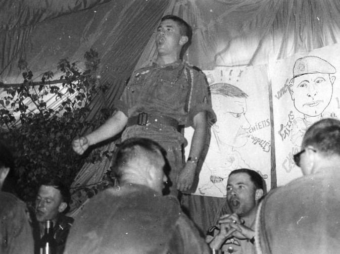 Repas de départ du Capitaine Jean Bernard Pinatel et de prise de Commandement du Capitaine Jean de Warren. Debout le sergent Gerard Dulion qui joue le Maitre de Chants. A droite de face, Capitaine Pinatel, à gauche le Capitaine de Warren.