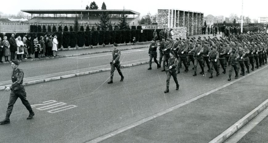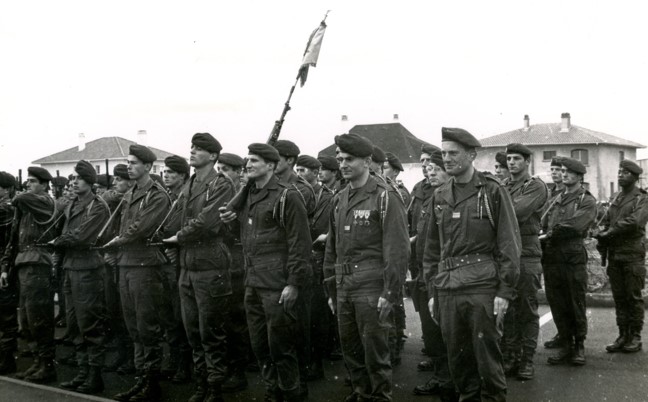 En 1972, défilé à Tarbes : Prises d'Armes de fin de manœuvre Brigade. En tête le Capitaine Jean de Warren, Lieutenant Gérard de Badts, Sous-Lieutenant Bartoli Chefs de Section.