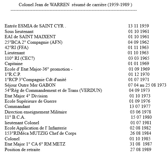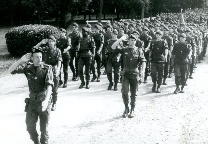 En 1972, camp d'Idron, sur l'allée du cinéma, Saint Michel ? En tête le Capitaine Jean de Warren, Lieutenant Gérard de Badts, Sous-Lieutenant N d'Aboville chef de Section. Porte Fanion Sergent Chef Geisler