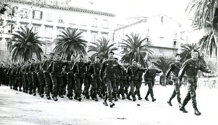 Défilé à Bastia après exercice de projection Outre Mer. En tête le Capitaine de Warren, Lieutenant de Badts, et X réserviste. Porte Fanion Sergent-Chef Mondon.