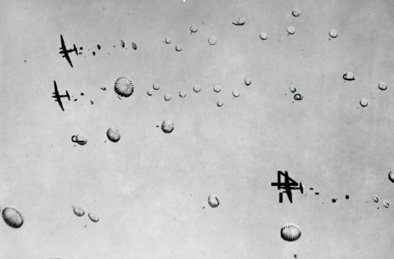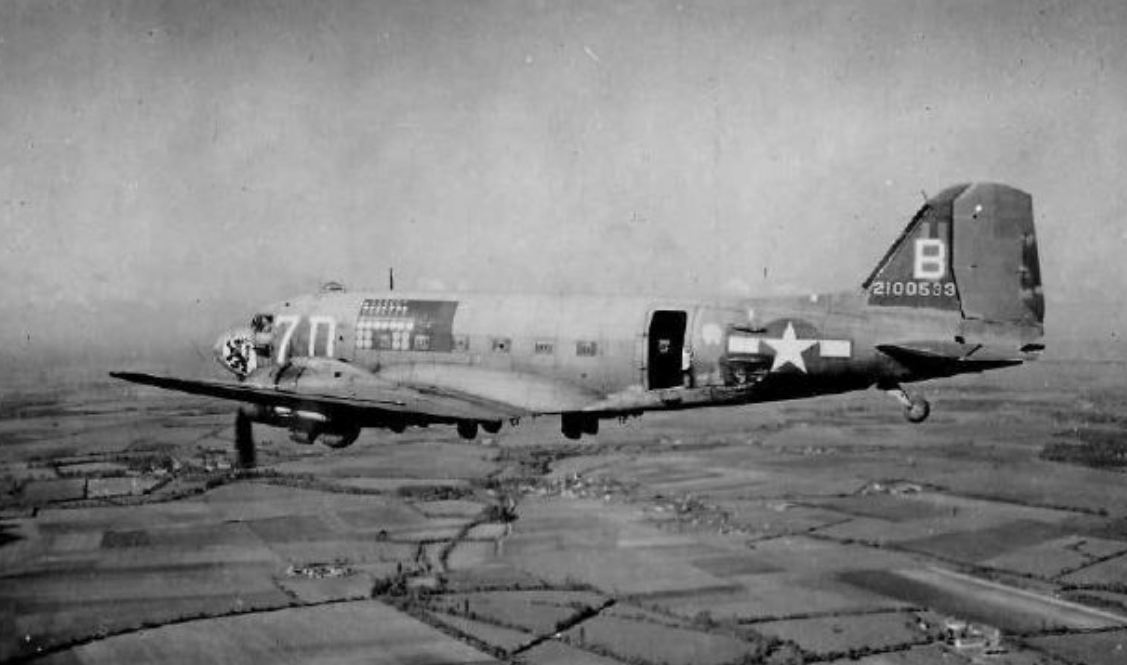 Montée dans un ► C47 Cliquez sur l'avion pour agrandir " Après 1 heure de vol nous arrivons à proximité le la "drop zone" Une équipe de "pathfinders " (radioguidage ) parachutée il y a à peu près une heure l' a délimitée et balisée .Après quoi lorsque tout a été pret elle a appelé les avions " Cliquez sur l'avion pour agrandir " Je regardais par un hublot, nous prenions de la hauteur, nous passions au dessus d'un village , nous virions , il y avait un curieux petit cimetière en bas , les tombes semblaient disposées en cercle On aurait dit un colimaçon. Un copain fit quelques plaisanteries sur ce terrain d' atterrissage, le dernier " Cliquez sur l'image pour agrandir