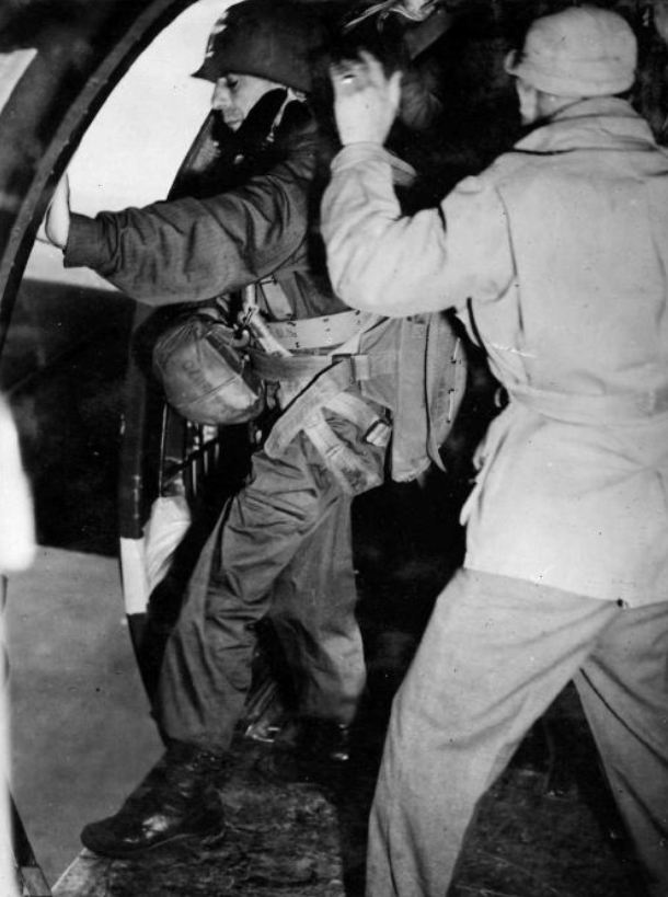 " Le pas décisif est fait !! A Dieu vat !! Il y a eu cette prodigieuse fuite du corps sous l' avion ,dans le vent des moteurs ...Ce creux au ventre soudain ..une seconde ..trois secondes ...combien ? " " On a été "baldingué dans les étoiles " On ne l' a réalisé que lorsque ce fut fini. Arraché aux épaules par le déploiement du parachute et balancé violemment ...En bas il y a des masses confuses des taches sombres "