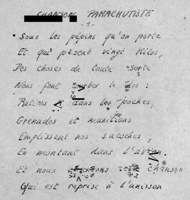 Ils avaient adopté de vieilles chansons de l' Armée d' Afrique dont ils avaient recomposé les couplets ,à la sauce parachutiste . CHANSON PARACHUTISTE ( air : Y a des cailloux sur toute route ) Sous les pépins qu'on porte Et qui pèsent vingt kilos Des choses de toute sorte Nous font courber le dos Rations dans les poches Grenades et munitions Emplissent nos sacoches En montant dans l' avion Et nous chantons cette chanson Qui est reprise à l'unisson Ref : Y a des tapins tout le long de la piste Tout le long de la piste y a des tapins Pour embarquer tous les parachutistes Sautant en FRANCE dès demain matin En regardant par la portière Nous apercevons nos clochers Et pour fouler la terre familière Tous les gars sauteront sans hésiter Carabine en travers Pioche qui nous embarrasse Une porte qu'on passe Et l'on se trouve en l' air Le choc a été rude Le casque est sur le nez Mais tout s' est bien passé Enfin pourvu que ça dure Serrons les jambes à l' arrivée Car une fois de plus on va trouver Ref Qu'y a des cailloux sur la drop zone Sur la DZ y a des cailloux Mais comme cette fois On sait que c' est la bonne On sourira en encaissant le coup Boches gare à vous La mort approche Nous ne ferons pas de quartier Vous périrez Sur la vieille terre de FRANCE Nous ne connaitrons pas la pitié Tuer , venger, mourir Tout avec le sourire Et les parachutistes alors Auront LA VICTOIRE OU LA MORT HYMNE DU REGIMENT DE CHASSEURS PARACHUTISTES ( Air du Chant des Bataillonnaires) Ref En passant par la portière Souviens toi oui souviens toi Qu'un jour il pourra se faire Malgré toi oui malgré toi Qu' après une chute libre Tu auras cessé de vivre En torche dans l' athmosphère Tu tomberas comme une pierre Il est sur la terre d' Afrique Un régiment dont les soldats A chaque instant risquent leur vie Parachutistes nous voila Pour faire partie de cette élite Il faut bien être un peu cinglé Et surtout pas s' faire de bile Savoir bien boire et s' amuser Mais après tout qu' est ce que ça fout Et on s' en fout Mais comme on n' a jamais eu de veine Pour sur qu'un jour on y restera Sur cette garce de terre Africaine A cent à l'heure tu t' écraseras On t ramassera les côtelettes Avec un sac à effets chauds On dira saperlipopette Ce pauv gazier n' a pas eu d'pot On t mettra entre quatre planches Enveloppé dans ton pépin Au cimetière de Maison blanche T'auras l' adieu de tes copains Avec les honneurs militaires On déposera sur ton tombeau Une croix de bois réglementaire Ce jour la sera le plus beau