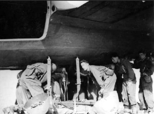 Emploi des Troupes Aéroportées: Sans refaire l'histoire des T.A.P. depuis leur expérimentation par l'URSS, l’Allemagne , la GRANDE BRETAGNE on peut affirmer sans risque d' erreur que la doctrine aéroportée était au point en 1945 . Les alliès maitrisaient parfaitement les techniques de mise à terre des parachutistes et de leurs colis d' accompagnement . Les seuls progrès accomplis depuis concernent essentiellement les largages lourds et la pratique de la chute libre opérationnelle . Le 18 Mai 1945 la 82° Division Aéroportée US à laquelle appartient le 1° R.CP.organise sur NERONDE ( entre AVORD et NEVERS ) un assaut vertical mettant en œuvre tout le 1° RCP . Le déroulement sommaire d'une O.A.P. est le suivant - Choix d'une zone qui permette sans pertes excessives de larguer le volume de paras souhaité .C' est en terrain libre il y a des maisons , des haies , des chemins etc ..;rien à voir avec les zones de saut soumises aux contraintes du temps de paix - L' effet de surprise doit jouer pour que l' ennemi ne puisse pas entraver le bon déroulement de l'opération - Sur la plateforme d' embarquement , mise en condition des personnels pour le saut , équipement des avions avec arrimage des colis d' accompagnement sous le ventre des C 46 - A l' heure H un largage de "path finders " c' est à dire des éclaireurs , est effectué Ces path finders ont pour mission de marquer la zone de mise à terre à l'intention des aéronefs mais aussi de sécuriser les abords face à un ennemi potentiel , d' entrer en liaison avec le commandant de la flottille aérienne pour apporter les derniers renseignements et enfin de guider les paras lors du regroupement ; - A l' heure H + 1 la première vague se présente Les avions larguent en formation et saturent le ciel de coupoles Pendant que les parachutistes récupèrent les colis d' accompagnement ( armes lourdes munitions etc ..) puis se regroupant par éléments organiques rejoignent leurs emplacements de rearticulation ,arrive la vague suivante A NERONDE quelques petites minutes séparaient les deux vagues d' assaut car le 1° RCP disposait du nombre suffisant d' aéronefs pour embarquer la totalité du régiment en une seule rotation Sur les photos de ce témoignage on voit des panneaux de marquage sur la zone de mise à terre , un clairon qui sonne pour regroupe une Compagnie ... La densité du largage permet de mieux comprendre la notion d' "assaut vertical "