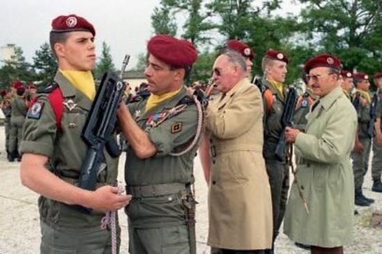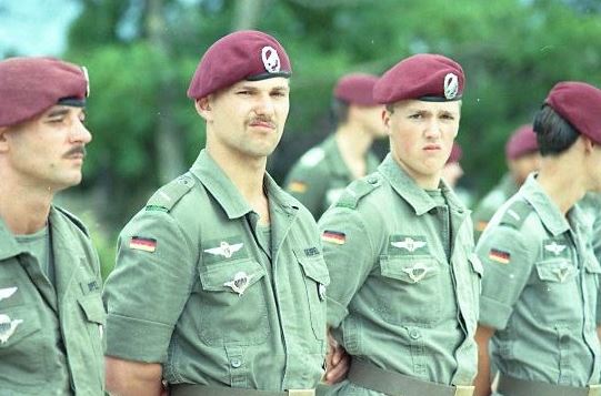 " Depuis un observatoire naturel le Général GRANGER, Lieutenant Colonel BRESSE Chef du BOI, un officier d' Etat Major ,Le Colonel JP VOLA .suivent le largage d'un Sous Groupement Aéroporté sur la zone proche du Quartier SAUVAGNAC . " Le spectacle ne laisse pas indiffèrent le Général Inspecteur qui est un vieux parachutiste Il a succèdé au Capitaine BIZARD au commandement de l' Escadron du 1°R.C.P. en ALGERIE Il a aussi commandé le 9° R.C.P.à TOULOUSE" Exercice tactique " Interception d'un Lieutenant qui subit un interrogatoire un peu narquois " " Général GRANGER ,Colonel JP VOLA,Lieutenant Colonel Ch CHANTECLAIR Lieutenant colonel BRESSE. Pour avoir vécu à la mème époque ce type d'inspection , le rédacteur en avait conclus que le Général GRANGER vieux guerrier accueillait avec bonhomie tout ce qui lui était présenté mais n' aimait pas trop que l'on tente de le bluffer " Chaîne de décontamination nucléaire , biologique , chimique . " Accès au circuit de décontamination du Régiment Tous les matériels souillés sont nettoyés " " Pour les parachutistes un circuit balisé est organisé " " Les vêtements contaminés sont déposés à l' entrée du circuit et après la décontamination corporelle les parachutistes perçoivent des vètements propres " " Le général s' avise que ses rangers sont maculées de boue ...il en profite pour tester une lance de décontamination et du coup nettoyer ses chaussures " Juin 1988 : Séance photos pour préparer la Passation de Commandement de la Compagnie d'.Appui.(BLEU) " A gauche le Capitaine CHAUDRON quittant son commandement à droite le Capitaine THUET prenant le commandement de la Compagnie d' Appui - BLEU - Les Sections sont représentées par l' armement de leur spécificité Un mortier de 120,un canon de 20 anti aérien , une jeep Milan missile anti char Le Fanion est celui créé en ALGERIE avec la devise NE PAS SUBIR" Voir à ce sujet Fanions du 1° RCP sur ce même site. " Dans les coulisses de l' atelier photo...Visiblement le filtre à effets spéciaux ne convient pas " Juillet 1988 : Fraternisation Franco - Allemande à l'issue de l' Exercice COLIBRI " Prise de commandement conjointe alors que les couleurs Allemandes et Françaises sont prètes à être montées Sur la façade de la tour de commandement du 1° RCP les insignes du 1° RCP, de la 11° Division Parachutiste , du 144 Régiment d' Infanterie (réserve ).Au pied du mat des Couleurs la plaque d'inauguration de la Place JEBSHEIM ( Colonel A.FAYETTE au CAMP d' IDRON) " Revue des troupes " La préséance est dévolue au Commandement Français pour passer en revue les Parachutistes Allemands .Colonel JP VOLA Chef de Corps suivi du Lieutenant colonel Ch CHANTECLAIR Commandant en Second " " La préséance est dévolue au Commandement Allemand ( Lieutenant Colonel )pour passer en revue les Parachutistes Français . Successivement I° Compagnie VERT Capitaine DELACHESNAY 2° Compagnie ROUGE Capitaine G.PERIE" Cérémonie des Couleurs " Montée des Couleurs Françaises et Allemandes On apprenait (autrefois) que l'on devait, toute affaire ,cessante faire face à la direction d' ou provenait la sonnerie des couleurs " " Le symbole de la fraternisation est scrupuleusement mis en valeur " " Le partage de l'image est équitablement réparti " " Cadres sans troupe du 1°RCP .Rang de Parachutistes Allemands Au garde à vous ils serrent les poings " " Belle allure de ces Parachutistes " Allocutions " Chaque Commandant des Troupes prononce une allocution que l'interprète tête nue et barbu consigne sur un carnet " Remise des Brevets " Le Colonel JP VOLA remet son Brevet à un Adjudant Chef .Le Capitaine DELACHESNAY (VERT ) remet son Brevet à un Chasseur Parachutiste" " Le Capitaine G.PERIE ( ROUGE) est confronté à la difficulté de fixer un Brevet .Un Lieutenant de la 2° Compagnie face à un Parachutiste de grande taille .Ce sont deux caporaux auxquels ils remettent le brevet ." Les nouveaux brevetés à l'honneur " Visages impénétrables de deux soldats nouveaux Brevetés . La moustache semble à la mode chez les Parachutistes Allemands dans cette fin des années 80 . L' emplacement velcro libre est destiné à la fixation d'un tissu sur fond vert représentant un aigle de face ailes déployées Cet insigne est décerné aux militaires ayant atteint un certain niveau de qualification ( technique , sport , commandement ...) Trois niveaux se distinguent à la couleur de la broderie : Bronze , Argent ,Or" " Photos - souvenir devant le mat des couleurs au garde à vous ou bien au repos .Sur le beret l'insigne en métal des Chasseurs Parachutistes , très proche de celui de leurs origines. Un rapace qui fond du ciel .Le Brevet de Parachutiste Allemand est porté en tissu sur les treillis Le brevet en métal étant plutot dédié à la tenue de sortie " " Les Parachutistes Allemands portent divers insignes en tissu ou en métal ; .Le Drapeau Allemand sur les deux manches .Coté gauche de la poitrine le Brevet Allemand tissé en dessous duquel le Brevet Français .Pour certains un insigne représentant deux feuilles de chêne sur fond vert qui atteste d'un stage commando .Poitrine coté gauche insigne métal du 251 ° Bataillon de Chasseurs Parachutistes .Certains Chasseurs Parachutistes portent sur la manche un Brevet de Parachtiste Belge , d' autre sur le coté gauche de la poitrine un Brevet de Parachutiste U.S.L' aigle en dessous de la poche gauche est défini ci dessus ( niveau de qualification )" " C' est un fait régulièrement observé lors des remises de décorations ou de brevets ..Le récipiendaire regarde et souvent touche ce qu'on vient de lui remettre comme pour s' assurer de la réalité des faits l Sur la tenue de treillis nos camarades Chasseurs Parachutistes Allemands affichaient beaucoup d'insignes !!" Mise en place pour le défilé " Les autorités se dirigent vers l'estrade devant laquelle défileront les troupes .c' est à dire sur la route de l'
