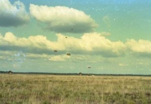 Avril 1988 : Séance de saut Régiment sur le zone de saut du Camp de SOUGE Michel BERNATETS a suivi le Chef de Corps . " Le Colonel JP VOLA ( chef de Corps) et le Lieutenant Colonel Christian CHANTECLAIR( Commandant en Second) se dirigent vers l' aire de réintègration des parachutes. " " Les mèmes tète nue .Au second plan descente sous voile gaines larguées .La zone de saut parait confortable " " Pose sportive du Chef de Corps .Belle charrette dans le ciel " " Michel BERNATETS ne peut s' empècher de profiter de l' occasion pour prendre des clichés artistiques . Le parachute qui s' affale mollement est un EFA 72-12 Il avait fallu ajouter une résille tout le long du bord d' attaque ,ce dernier ayant la facheuse tendance à rester collé au moment de l'ouverture .D'une surface d' environ 70 m2 ce parachute offrait un meilleur confort et permettait l' emport d'une charge supèrieure à celle du 60 m2 " Mai 1988 : Essais de photos sur le Drapeau du 1° R.C.P. " Le Drapeau transcendé par un soleil rayonnant . Ce Drapeau n' est plus en service .Il a été remplacé par un nouveau Drapeau confié à la garde du 1° R.C.P de PAMIERS -période des Engagés Volontaires et des OPEX " " Le Drapeau entouré des Fanions d' unités , avec et sans le filtre soleil .C'est finalement la photo sans filtre à effets spéciaux qui sera retenue par le Chef de Corps .L'Emblème et les Fanions sont présentés à l' avers . A gauche du haut vers le bas :C.A. C.C.S. 12° Cie . A droite du haut vers le bas :1° .2° .3°.4° Compagnies . Ces Fanions sont décrits à la rubrique FANIONS du 1° RCP sur ce même site. 26 Mai 1988 : Présentation au Drapeau et remise des Fourragères au contingent 1988 / 04 " Revue des troupes par le colonel JP VOLA accompagné du Capitaine MASSON . Le Capitaine SECHEPINE commandant la 12° Compagnie (ORANGE ) et son Fanion au modèle 1972 ( revers tranché de bleu clair à la hampe et de rouge aux parties flottantes) " Honneurs au Drapeau et sa présentation au Contingent 1988/04 .Cette cérémonie consacre l' entrée des jeunes Parachutistes dans l' ordre de bataille du Régiment en cas de conflit armé " " Au centre de la Place JEBSHEIM le Chef de Corps prononce une allocution sur le symbole du Drapeau et la signification des Fourragères .Au coté gauche le poignard USM 8 réglementaire " " Remise des fourragères aux appelés Volontaires Parachutistes du contingent 1988/04 ,opération pour laquelle les cadres du Régiments sont assistés par des anciens du 1° RCP " " Le Lieutenant Colonel Ch CHANTECLAIR repère le photographe .Le Capitaine G.PERIE (ROUGE) rejoint son emplacement sur les rangs" " Le Chef de Corps décore trois Chasseurs Parachutistes de la Médaille de la Défense Nationale " " Derrière le Drapeau il semble que ce soit la 2° Compagnie qui ouvre le défilé. La Musique de la RMD de BORDEAUX joue une marche ; Des deux cotés de l' estrade les nouveaux décorés ainsi que les anciens avec le Drapeau de l' Amicale des anciens du 1° RCP " " Il semble qu' à la 2° compagnie succède la 12° Compagnie"