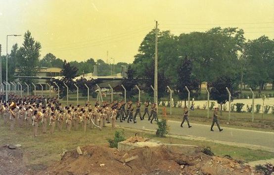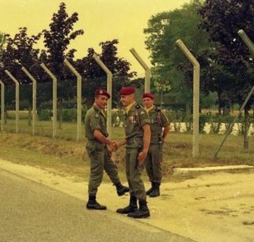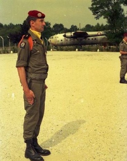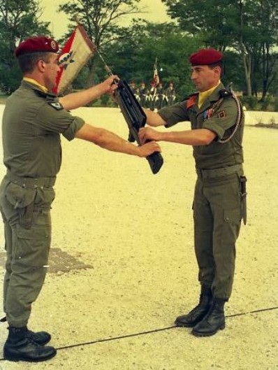 " Vue d' ensemble de la Place des Quinconces .Au premier plan les tribunes officielles .Le 1° RCP occupe le coté opposé aux tribunes .Le Général commandant la RMD vient de saluer le Drapeau du 1° RCP etant donnée la distance à parcourir la revue des troupes s' effectue à partir d'un véhiicule de commandement .Le Régiment aligne quatre compagnies à deux pelotons .La musique est à la hauteur de la route qui coupe la place en deux, perpendiculairement à l' axe de défilé " " Tout le Régiment est engagé sur l' axe de défilé .Comme c' est le cas à PARIS le dispositif s' ouvre en deux parties symétriques .Au premier Plan VERT amorce le mouvement de séparation " " Manoeuvre arfaitement réussie par la 1° compagnie .Le 1° RCP a fière allure . La route constitue le repére à partir duquel s' opère la séparation " 8 Aout 1988 : Passation de Commandement à la Compagnie d' Eclairage et d' Appui (CEA ) BLEU et à la 12° Compagnie ORANGE . Le Colonel JP VOLA avait regroupé à cette occasion l' accueil du Contingent 1988-06 et deux Passation de Commandement en une seule cérémonie . Premier tableau :Préliminaires à la C.A. " En présence du Drapeau ,la C.A. est rassemblée pour les Honneurs au Fanion ." " Les Sections se présentent à pied " " Un petit axe goudronné se préte parfaitement à cette présentation en ligne de Sections " " Le Sergent Chef Bernard VERET Porte une dernière fois avant son départ à la retraite le Fanion à la devise NE PAS SUBIR ." " Le Capitaine Henri CHAUDRON confie le Fanion au Sergent Chef BESSE de la Section de mortiers lourds. Ce sous Officier est breveté Chuteur Opérationnel, c' est lui qui sera le Porte Fanion du Capitaine THUET" Second tableau : Revue des Troupes. " Photo souvenir pour deux Appelés Volontaires Parachutistes de la Garde du Drapeau .Les véhicules des Sections parés pour le défilé sont en attente " " Plan sur les Anciens du 1° RCP avec le Drapeau de l' amicale ,à la droite duquel le Colonel ALLARD Président . Capitaine DELACHESNAIE Commandant la 1° compagnie avec son Porte Fanion " Troisième tableau : Présentation au Drapeau du Contingent 1988 / 06. " Le Drapeau du 1° RCP entre sur la Place JEBSHEIM ou les Honneurs vont lui être rendus Au centre ,en képi le Capitaine JULIEN du CM 57 ° Il porte l'insigne du CEC 30 de BONIFACIO dont il a commandé la CCS . Maître d' Armes c' est un vétéran d' ALGERIE " " Le Drapeau défile devant les rangs Les cadres sans troupe saluent " " Les jeunes Appelés Volontaires Parachutistes du contingent 1988 - 06 rendent pour la première fois les honneurs au Drapeau du 1° RCP " " Le photographe a saisi l'image rare et charmante d'une Assistante Sociale Militaire en tenue Elle porte l'insigne du Service Social des Armées" Quatriéme tableau :Remises de fourragères aux Appelés Volontaires du contingent 1988 - 06 " Un groupe de jeunes plus particulièrement méritants est mis à l'honneur et reçoit ses Fourragères des mains du Chef de Corps ou de quelques grand anciens vétérans de trois guerres " " Le Lieutenant Colonel Michel de FRITSCH ancien de BIZERTE et de la guerre d' ALGERIE a commandé la 3° Compagnie au Camp d' IDRON à la suite du Capitaine M.de WARREN." " Remise des Fourragères par des anciens d' INDO et d' AFN " Cinquième tableau :Remise de décorations " Le Colonel (ER) ALLARD Président de l' Amicale des Anciens du 1°RCP remet la Croix d' Officier de l' Ordre National du Mérite au Lieutenant Colonel (ER) Michel de FRITSCH qui reçoit les félicitations amicales du Colonel JP VOLA Chef de Corps .Ils ont commandé ensemble au CAMP d' IDRON l'un la 2° l' autre la 3° " " Le Capitaine THUET reçoit la Médaille du Service National du Chef de Corps .Sur l' épaule gauche du récipindaire un Brevet de Parachutiste BELGE Ce Brevet était assez convoité car il comprenait un saut de ballon Il porte au coté ce qui semble être une baïonnette de Famas " " Capitaine MAUREL (Chef de la SML puis Adjoint du Capitaine THUET auquel ,in fine ,il succédera ,)décoré de la Médaille du Service National par le Chef de Corps" " Capitaine BONNET décoré de la Médaille du Service National par le Chef de Corps" " Capitaine RANCHER décoré de la Médaille du Service National par le Chef de Corps " Sixième tableau : Passation de Commandement de la CEA entre le Capitaine H.CHAUDRON (quittant ) et le Capitaine THUET (prenant ) " Le Capitaine Henri CHAUDRON et son Porte Fanion se dirigent vers le centre de la Place JEBSHEIM. Le Capitaine Henri CHAUDRON prend le Fanion de la C.A. que porte le Sergent Chef BESSE .Tranché de Bleu et de Jonquille ce Fanion est très reconnaissable " " Le Capitaine Henri CHAUDRON rend le Fanion de la CA au Colonel JP VOLA L'échéance est inéluctable ,mais c' est un moment difficile " " Le Capitaine THUET reçoit le Fanion de la Compagnie d' Appui et se dirige vers le Porte Fanion " " Le Capitaine THUET confie le Fanion au Sergent Chef BESSE Le Capitaine Henri CHAUDRON prend concrétement conscience qu'une page vient de se tourner " " Le Colonel JP VOLA désigne le nouveau Commandant de Compagnie en prononçant la phrase d'intronisation " Septiéme tableau :Passation de Commandement de la 12° Compagnie entre le Capitaine SECHEPINE ( quittant ) et le Capitaine BOULLIER ( prenant) " Le Capitaine SECHEPINE prend le Fanion de la 12° Compagnie et se dirige vers le Chef de Corps ". " Après avoir rendu son Fanion au chef de Corps le Capitaine SECHEPINE assiste à l'intronisation de son successeur " " Le Capitaine BOULLIER entend la phrase " ..vous reconnaitrez désormais pour votre chef le Capitaine BOULLIER ici présent ......" " Le Capitaine BOULLIER ne cache pas sa satisfaction en recevant le Fanion de la 12° Compagnie qu'il va confier au Porte Fanion " " Le rituel est accompli le Porte Fanion retrouve le Fanion et la 12° compagnie a un nouveau chef " " Le Colonel JP VOLA lit l'Ordre du Jour résumant le commandement du Capitaine SE