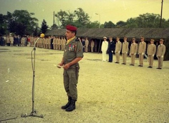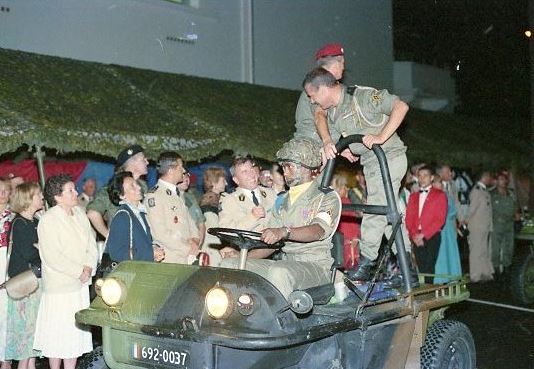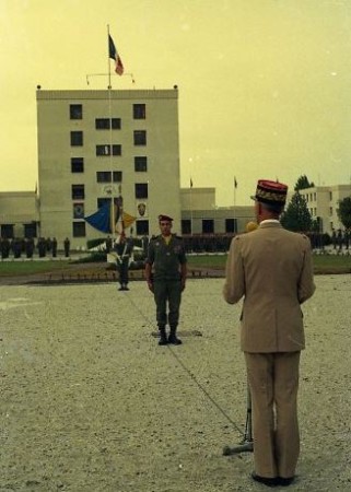 01 septembre 1988 : Passation de Commandement au 1° R.C.P. entre le Colonel JP VOLA (quittant) et le Lieutenant Colonel Patrice de LOUSTAL (prenant) Premier tableau : -Le Colonel JP VOLA dans son commandement . - Le Lieutenant Colonel Christian CHANTECLAIR a déjà inspecté le dispositif et présenté les troupes au Colonel VOLA .Ensemble ils passent en revue les troupes sous les armes et saluent les invités " Le Lt Colonel P.de LOUSTAL est sur les rangs il échange le salut avec le colonel JP VOLA .A sa gauche les cadres du 144° Régiment d' Infanterie - de réserve -puis les cadres sans troupe en particulier de l'Etat Major et de la CCS du 1° RCP " " Un important détachement composé d'officiers supérieurs invités Ils proviennent de l' EM de BORDEAUX des corps de la 11° DP ou sont tout simplement invités à titre personnel " " Le Colonel JP VOLA et le Lt Colonel Ch CHANTECLAIR échangent le salut avec l' autorité de chaque détachement. Les anciens du 1° RCP sont nombreux autour du Drapeau de leur amicale et de leur président le Colonel (er) ALLARD.Beaucoup portent l''imperméable d' Officier avec ou sans la ceinture .Deux calots de l' Armée de l' Air désignent des vieilles suspentes .Le Capitaine CLEDIC est identifiable à sa moustache .Ce grand soldat oeuvre sans relache pour que la Fourragère Rouge soit attribué au 1° RCP au titre de la Guerre d' INDOCHINE -ce qui au regard des textes de référence est impossible -" Les Honneurs sont rendus au Drapeau du 1° R.C.P. " Le Colonel JP VOLA accueille de Drapeau du 1° RCP auquel les Honneurs sont rendus (Sonnerie Au DRAPEAU Refrain de la MARSEILLAISE) La garde du Drapeau porte les "gants à crispin" attributs spécifiques de cette fonction Au fond,à droite, sous un couloir de tentes modèle 56 à pans relevés, les familles assistent à la cérémonie" " Un rang de généraux est à l'honneur au centre du dispositif .De gauche à droite Capitaine de Vaisseau de ROQUEFEUILLE,Général Commandant Légion de Gendarmerie ,Général CARDINAL-ancien chef de corps1982/1984 C' est sous son commandement que le Régiment à déménagé d 'IDRON à SOUGE - ( ) ( ) Général M.BRENAC-ancien chef de corps 1970/1972 C' est à lui que nous devons les Fanions réglementaires au modèles 1972 -,Général GUICHARD. Le Colonel JP VOLA prononce une allocution " Allocution du Colonel JP VOLA dont le visage est marqué par l' émotion ." Le Colonel JP VOLA accueille les autorités qui vont saluer le Drapeau du 1° RCP " Avant l'inspection des Troupes les autorités saluent le Drapeau " Deuxième tableau : Le Général Michel GUIGNON dans son commandement . Revue des Troupes " La revue des troupes est passée par les seules autorités situées dans la chaîne de commandement du 1° RCP. Le Général SALVAN Commandant la Région Militaire de Défense de BORDEAUX( réprésenté par un Adjoint) Le Général GUIGNON Commandant la 11° Division Parachutiste , le Général M. LORIDON Général immédiatement sobordonné au Général M GUIGNON pour les Régiments d' Infanterie Parachutistes Appelés (RIP de type B) La préséance est accordée au Colonel JP VOLA pour cette dernière revue de son Régiment " " Les autorités sont au niveau de la CA. On reconnait le Fanion de l' Escadron ( SER ) au bout d'une lance .Au milieu de la Tour PC les couleurs du 1° RCP :le Bleu et Jonquille dont on dit que le Régiment les doit au Colonel FAURE prestigieux chef de corps de la Seconde Guerre Mondiale " " Passage des autorités devant les anciens du 1° RCP " Lecture de l' Ordre du Jour " Le Porte Drapeau sans sa garde s' est placé face au Général M.GUIGNON Le Colonel JP VOLA au centre du dispositif fait face au Général M.GUIGNON qui lit l'ordre du jour . Belle symètrie des acteurs et du décor . Le mat des couleurs situé dans l' axe central de la tour de commandement et des couleurs du 1° RCP ,les Couleurs Nationales se découpant sur l' azur " " L'Ordre du Jour -relatif au temps de commandement du colonel JP VOLA - s' écoute en position du Garde à vous "( ) Rituel de Passation de Commandement " Après la lecture de l' Ordre du Jour le Colonel JP VOLA se place à la droite du Général COMDIV cependant que le Lieutenant Colonel P. de LOUSTAL se place à sa gauche " " Le Colonel JP VOLA et le Lieutenant Colonel P de LOUSTAL se saluent et échangent leur place ." " Le Général M GUIGNON prononce la phrase rituelle qui intronise le nouveau Chef de Corps "Officiers , Sous Officiers ,Parachutistes du 1° Régiment de Chasseurs Parachutistes vous reconnaitrez désormais pour votre chef le Lieutenant Colonel de LOUSTAL ici présent - et désigne ce dernier du geste -vous lui obéirez en tout ce qu'il vous commandera pour l'observation des lois , l' execution du service et le succès des armes de la FRANCE " La musique ouvre et ferme le ban pour la proclamation de cette phrase " Troisième tableau : Le lieutenant Colonel Patrice de LOUSTAL dans son commandement Défilé des Troupes à pied " Les Sous Officiers sans troupe et une partie des familles invitées .La musique de la 11° Division Parachutiste a prèté son concours à la cérémonie " " Le lieutenant colonel Patrice de LOUSTAL défile en tète du 1° RCP. L' estrade habituelle a été agrandie pour pouvoir accueillir toutes les autorités de haut rang . Imperméables et parapluies fleurissent lors de cette journée avec averses intermittentes" " Le Drapeau du 1° RCP et sa garde suivi du Commandant en Second le lieutenant colonel Ch CHANTECLAIR " " Le second peloton de VERT suivi de NOIR. La Médaille Militaire agrafée à l' avers du Fanion identifie la Compagnie Les observateurs avertis noteront qu'il s' agit du Fanion à l' avers NOIR et non BLEU " " BLEU défile suivi de ORANGE " " Deux pelotons de la 12° Compagnie ORANGE " Défilé des Troupes motorisées " Défilé motorisé de la C.A.( BLEU) Capitaine THUET " " Défilé d'une Section Antichar MILAN .SAC " " Défilé de Section d'Eclair