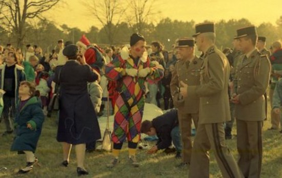 Décembre 1988 : Arbre de Noël du 1°RCP La journée Arbre de Noël Régimentaire est une tradition visant à la cohésion .Elle est destinée aux familles mais aussi aux Parachutistes .La forme de cette célébration dépend de nombreux facteurs :de la mode , des usages du Régiment ,des moyens disponibles .Le rédacteur a toujours connu depuis 1960 cet usage . 1989 à SOUGE au quartier SAUVAGNAC du 1°RCP cette journée a vu la mise en oeuvre d'un petit train ,d'une démonstration de saut avec un Père Noël , de personnages grimés , d' animations pour les enfants ,d'un goûter , d'une remise de cadeaux . Petit train .