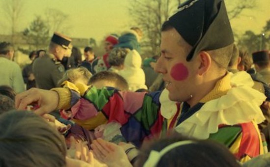 " Le clown au bicorne qui distribue des bonbons n' est autre que le sympathique Capitaine HECTOR Commandant la 4 ° compagnie -GRIS- Cet Officier est un spécialiste hautement qualifié des techniques aéroportées"