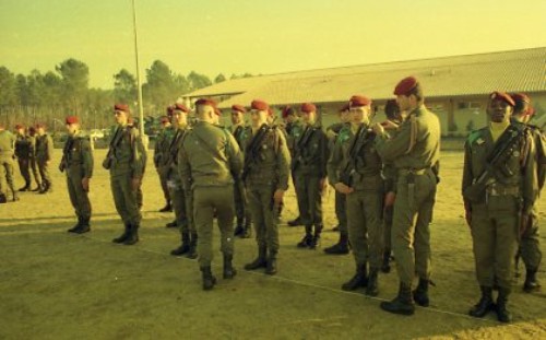 Un groupe de Jeunes Appelés Volontaires Parachutistes de la 1988-12 méritant se préparant à recevoir les Fourragères de la main des autorités. Les Foulards verts indiquent la 1° compagnie .
