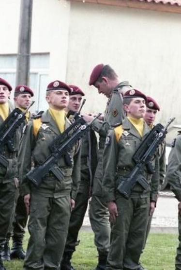" Vin d' honneur précédé des allocution du Maire et du Commandant des Troupes " " Un beau trio d' anciens prend la pose cependant que les jeunes convives devisent joyeusement " Le 26 Février 1988 : dans l' après midi Le Colonel VOLA et le Détachement GUEPARD II rentrent de Nouvelle Calédonie .Le GUEPARD se composait des 2° 3° 4° Compagnies du 1°RCP renforcée de la 1°Compagnie du 6° RPIMa et d'une compagnie de Commandement selon le TED GUEPARD II " Le Capitaine J.P. VOLA apparait en premier à l' avant du 747 ,suivi bientot des cadres et Parachutistes du GUEPARD II " " Débarquement par l' escalier roulant arrière du 747 " " Accueil à l' aéroport de MERIGNAC part le Colonel COSTE Adjoint du Général Commandant la 11° D.P. pour les R.I.P. B Inspection du GUEPARD puis courte allocution de bienvenue " " La coutume effectuée ce sont les retrouvailles avec les familles " " Un piquet d' honneur de la Base Arrière accueille le GUEPARD II qui défile en arrivant au Quartier SAUVAGNAC dans le Camp de SOUGE " Le 1° Mars 1988 : en fin d' après midi au Quartier SAUVAGNAC ( Camp de SOUGE) Prise d' Armes pour le retour du GUEPARD II suivie d'un cocktail . Premier tableau : La mise en place des troupes et leur inspection sous les ordres du Commandant en Second le Lieutenant Colonel Christian CHANTECLAIR Le 1° RCP se présente d'un bloc . " Second tableau: Le Commandant en Second accueille le Chef de Corps Colonel JP VOLA qui prend le commandement du Régiment .Ensemble ils inspectent les Troupes " . " Au second plan l'insigne du 144°Régiment d'Infanterie .Régiment de Réserve dérivé du 1° R.C.P." " Troisième tableau :Les Honneurs sont rendus au Drapeau qui avec sa garde s'est place au centre de la Place d' Armes ,en arrière plan un Nord 2501 " "Le Régiment est présenté au Général de Division Michel GUIGNON Commandant la 11° Division Parachutiste .Belle présentation des ROUGES sous les ordres du Capitaine Georges PERIE " " Quatrième tableau : La revue des troupes par le Général débute par le Salut au Drapeau qui a rejoint son emplacement dans le dispositif " " Le Général GUIGNON suivi du Colonel VOLA et du Colonel (R) Commandant le 144 ° R.I. saluent les Fanions des compagnies " " Sans armes les cadres sans troupe ainsi que les délégations du Camp de SOUGE " " Cinquiéme tableau : Lecture de l' Ordre du jour .Profil de médaille , héros de la guerre d' ALGERIE au Régiment de COREE et au 1° R.E.P. le Général de Division Michel GUIGNON commande avec panache la 11° D.P. depuis juin 1987"