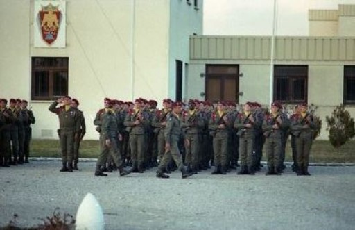 " Sixième tableau : Remise de décorations. Le Drapeau sans sa garde s' étant positionné au centre du dispositif . Le Général remet les Ordes Nationaux .Il décore son Chef de Cabinet -hasard du calendrier -un 1° Mars date anniversaire de sa blessure au combat en ALGERIE " " Septième tableau : le défilé des troupes .A droite du Général les récipiendaires sont mis à l'honneur La Musique de la 11° DP 44°DMT avec des tabliers de tambours new look ouvre le défilé au soleil couchant " " Le Colonel JP VOLA suivi du Drapeau du 1°RCP sous un ciel menaçant .Défilé de la 1° Compagnie VERT- Capitaine DELACHESNAY - " " Défilé de la 2° Compagnie ROUGE -Capitaine PERIE- et de la 3° Compagnie NOIR - Capitaine LEBEC-sur fond du Monument du DRAKKAR " " Défilé de la C.A BLEU - Capitaine CHAUDRON -et de la 4° Compagnie GRIS - Capitaine SERROR - " " Défilé de la 12° Compagnie ORANGE - Capitaine SECHEPINE-.Honneurs au Fanion par une compagnie devant son batiments Cette séquence n' était à l' époque pas prévue par le cérémonial officiel contrairement aux Honneurs au DRAPEAU qui constituaient le dernier tableau des Prises d' Armes " Selon l'usage le Général félicite le commandant des troupes pour la belle présentation de son Régiment Le 26 mars 1988 : Prise d' Armes pour la Présentation au Drapeau et la Remises des Fourragères au contingent 1988 / 02 . Réunion de l' Amicale des Anciens du I° R.C.P. " Arrivée des autorités :Colonel JP VOLA Commandant le 1° R.C.P.puis de gauche à droite en ligne Général DEGENE,Général M.BRENAC ,Colonel(ER) ALLARD ,Général BIZARD" " Honneurs au Drapeau :Le Drapeau du 1° RCP - A droite du Porte Drapeau ADJ TSCHANZ, a gauche Sergent Chef TAZAÏRT -" " Revue des Troupes :Le Colonel JP VOLA passe les troupes en revue accompagné du Général de Corps d' Armée BIZARD Héros des Guerres d' INDOCHINE et d' ALGERIE ancien Commandant de l' Escadron du 1° RCP en AFN " " Présentation au Drapeau :Le Drapeau défile devant les rangs pour que les Appelés Volontaires du contingent 1988 / 02 puisse le voir de près" " Remises des Fourragères aux Appelés Volontaires Parachutistes du contingent 1988/02 Le général M.BRENAC héros des Guerres d' INDOCHINE et d' ALGERIE (de face lunettes fut Chef de corps du 1° RCP au Camp d' IDRON (1970-1972 ) Le Général DEGENNE fut en ALGERIE le Chef du Commando du 1° RCP et servit à la 4° compagnie Commandant en Second du Colonel R.de BIRE au Camp d' IDRON (1972-1974) " En civil le Colonel (er) ALLARD Président de l' Amicale des Anciens du 1° R.C.P. familièrement surnommé TATAVE par ses pairs Il commanda le CNEC dans les années 70." " Le Général de Corps d' d'Armée BIZARD porte les insignes de Grand Croix de la Légion d' Honneur " " L'assistance parmi laquelle de nombreux anciens du Régiment...Le calot de l' Armée de l' Air d'une vieille suspente ,ancien de la Bataille d' ALSACE et des VOSGES"