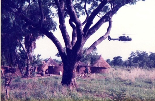 " Halte technique .Les participants à l' exercice ont noté que les toits au GABON étaient recouverts de toles alors qu' au TOGO ils l'étaient de chaume ou de branchages Briefing de l' Officier Opérations Le commandant PINATEL On reconnait l' Adjudant GERONI de profil"