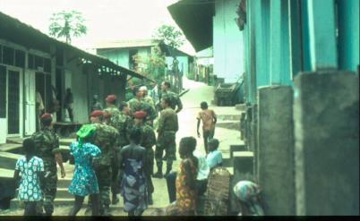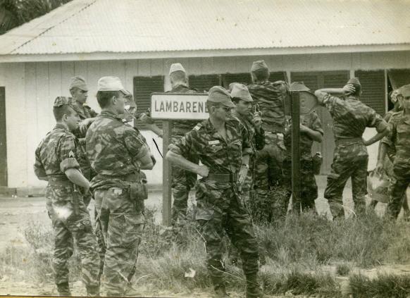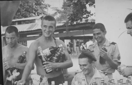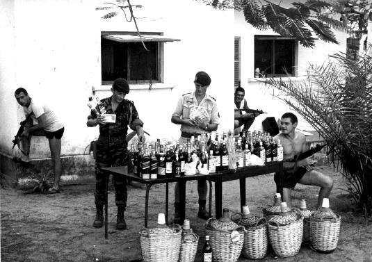 Les NOIRS s' amusent --------------------------------- Le Commissariat ( ex Intendance) mettait à disposition des familles des militaires en séjour au GABON un service d' achat de vins et spiritueux ..les cadres de la 3° en bénéficiaient et cela était pretexte au montage de scénes dignes du far west .... | | Dans le role du "taulier" l' Adjudant de Compagnie qui compte sa recette en gros billets C.F.A.et surveille sa marchandise | | |