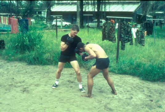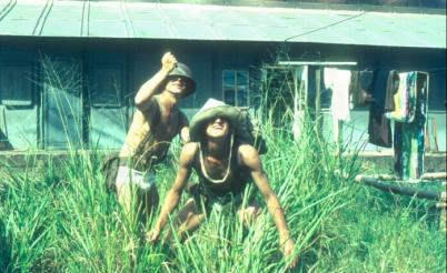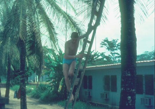 | Un copain explore le palmier à la recherche de noix de coco mures,au moyen d' une échelle de fortune | | D' autres ,adeptes de boxe , se "fendent la gueule" pour passer le temps ! | | |