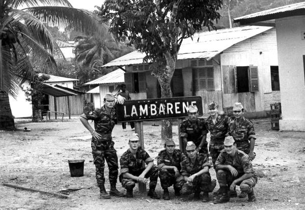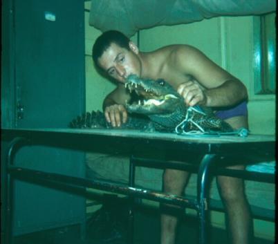 | Des chasseurs Gabonnais viennent régulièrement nous proposer des crocodiles .Celui que je tiens n' est pas bien gros ..mais il a une machoire un peu inquiétante tout de mème .Quelques cadres et des copains en ont acheté ...De retour en FRANCE ces bestioles ont été naturalisées. Un sous officier de la Compagnie avait laché le sien dans le bassin du CAMP d' IDRON en face de l' entrée de la 3°, des permissionnaires ont créé le spectacle en faisant courir un crocodile dans les couloirs du train qui les ramenaient chez eux ... | | | | |