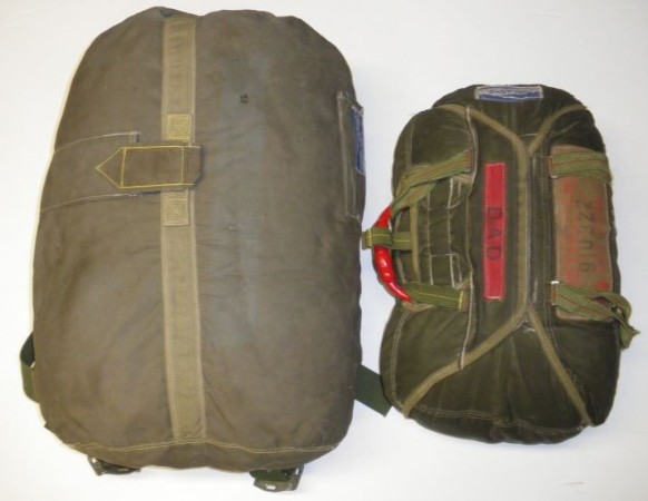 " Parachute dorsal et ventral de l' EPI .Le dorsal a changé d' apparence par rapport à ses devanciers .Il parait comme enveloppé d'une housse .Le ventral est équipé d'un dispositif d' aide au déploiement (D.A.D) "