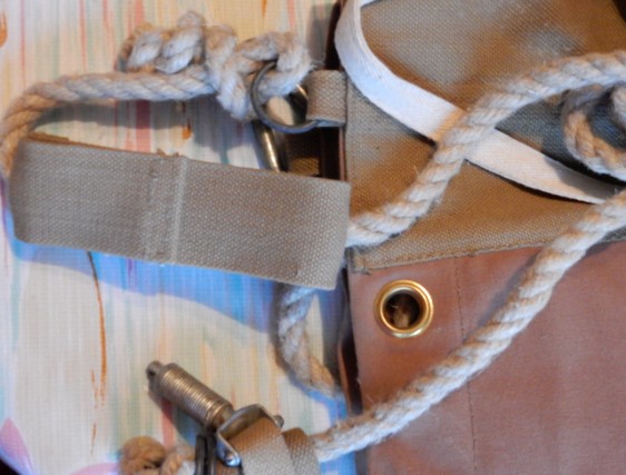 " Ce gros plan montre la petite courroie de cuir qui fait la liaison entre la claie et la partie basse du sac sous les deux poches latérales "