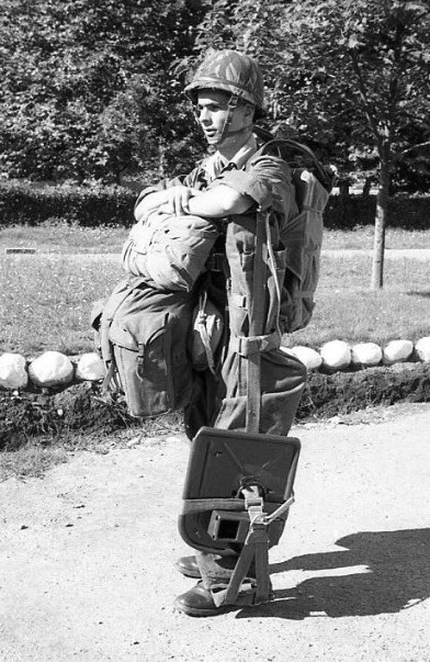 "Parachutistes du 18°RCP en 1956 à PAU et en 1959 à PHILIPPEVILLE , équipés de KIT BAG .Ces photos montrent bien l'inconfort généré par cette gaine lors des déplacements para équipé "