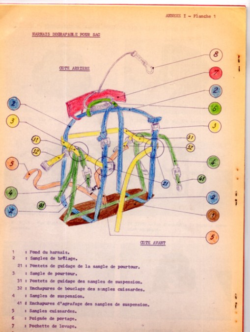 III° 1969 → Le Mémento à l' usage des Moniteurs Parachutistes (ETAP ) mis à jour en Janvier 1969 fait mention de deux gaines individuelles :l'EL 4 et l' EL 8 ( voir ci dessus ) En attendant l' arrivée de nouvelles gaines, certains cadres bricolaient un système s'inspirant du dispositif de largage du SAC TYROLIEN . Le sac TAP modèle 51 avait disparu dans les années 60 remplacé par un Bergham doté d'une petite armature à lames plates .Quand la musette était insuffisante pour les besoins d'une manoeuvre un peu longue il fallait bien sauter avec le Bergham.Ce sac était relié au harnais par la barrette de poitrine à laquelle on fixait les bretelles de transport .Une corde de délestage de 5 ou 6 mètres reliée à l' anneau de charge du sac et à la sangle fessière du harnais était maintenue lovée avec un élastique TAP Les liaisons sac Bergham et harnais se faisaient selon les moyens par simples noeuds ou avec des mousquetons à virole de sécurité ..Le moment venu il suffisait de dégrafer les bretelles du sac .Elles glissaient alors le long de la barrette de poitrine et le sac pendait au bout de sa corde de délestage .Ce dispositif peu apparent passait inaperçu ou était toléré par les moniteurs lors des inspections . Un bricolage de ce genre était pratiqué au niveau régimentaire par les Équipes de Recherche du 13° RDP
