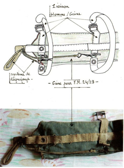" Le système de port ,en sautoir,des armes longues (FM 24_29) n' ayant pas donné satisfaction il fut imaginé une gaine largable spécifique pour le FM 24 X 29 .Cette gaine était fixée à la jambe du parachutiste par deux courroies verrouillées par deux aiguilles (comme le KIT BAG )Les poches extérieures avec rabat sont destinées à recevoir deux chargeurs et des éléments de l'unité collective du F.M. (béquille) " Témoignage du Sergent Louis Charles VIGNAUD du II°/1°RCP en INDOCHINE .(1948-1950 )