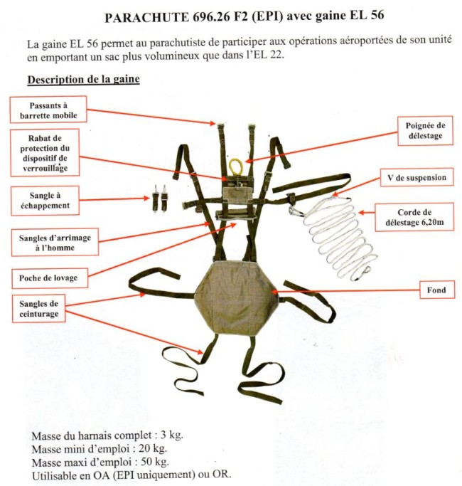 " L' EPC est destiné à remplacer progressivement l'EPI .Il offre une meilleure capacité d' emport et permet l' emploi du système FELIN .La coupole du dorsal ( 115 m2 ) est d'un aspect très caractéristique diffèrent nettement des formes hémisphériques traditionnelles.C' est l' ensemble de parachutage de l' après conscription ."