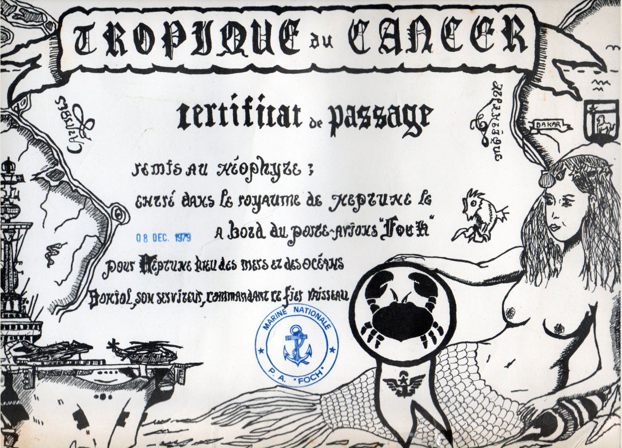 "Il semble que le cérémonial consiste à parquer les néophytes comme des moutons dans un espace clos puis à les arroser copieusement .." "Chaque néophyte se voit attribuer un beau diplôme commémorant son passage du Tropique du Cancer ."