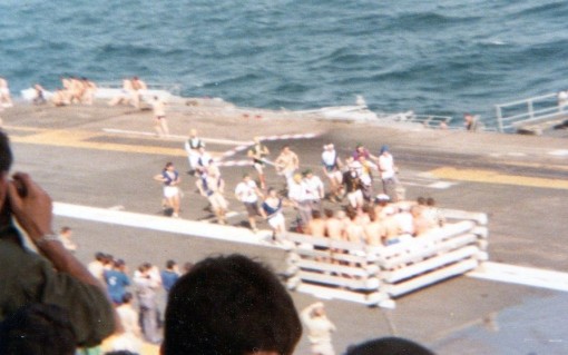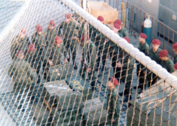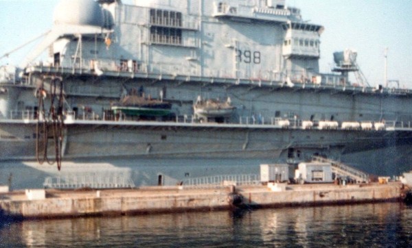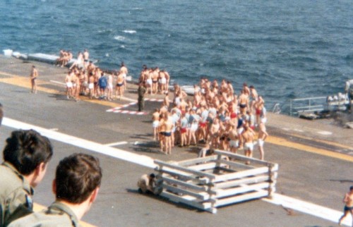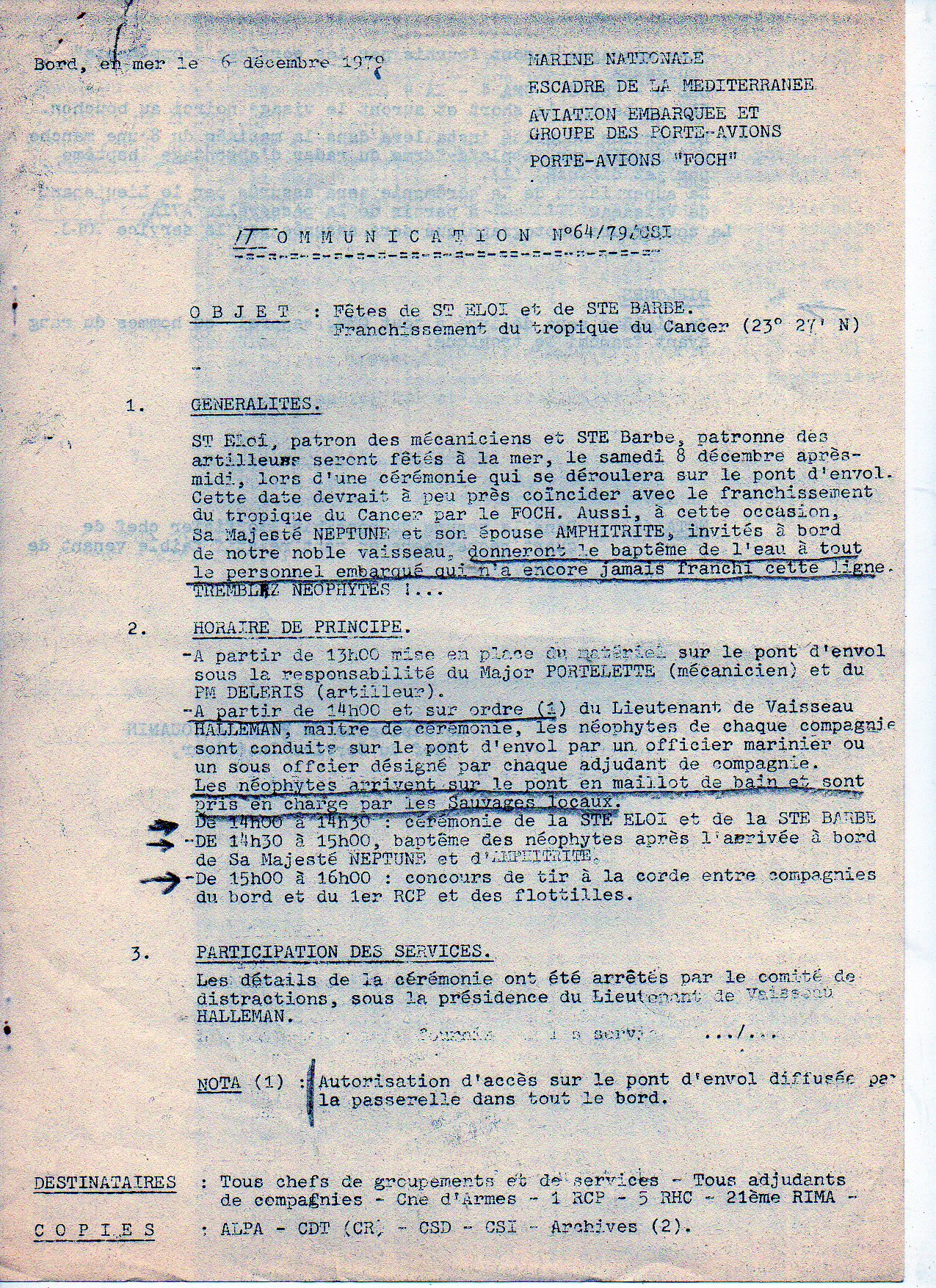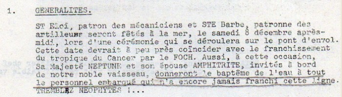 " Belle vue du porte avion FOCH prise à partir d'un hélicoptère .On voit bien les avions embarqués rangés sur le pont ."" " Pour egayer une traversée un peu longue il est prévu de fêter le 8 Décembre Fête de Saint ELOI et Sainte BARBE et premier franchissement du Tropique du Cancer pour le Détachement Guépard du 1° RCP "