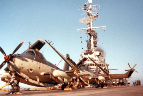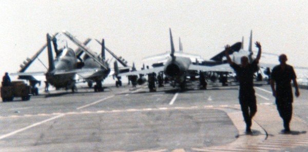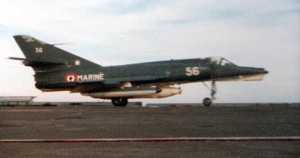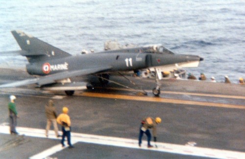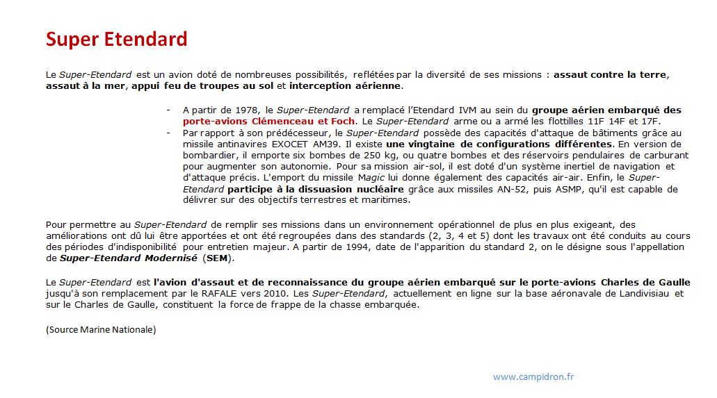 " Avions d'attaque embarqués de type Super Etandard ( mis en service en 1978 ) au parking , en configuration de poser ,en procédure d' envol ;"