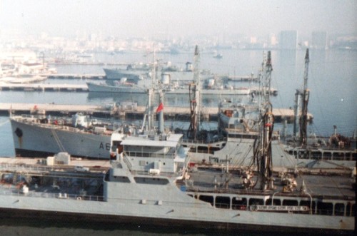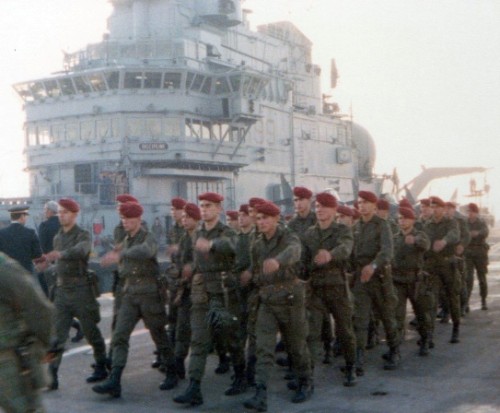 " Tout a commencé pour l' appelé Volontaire Parachutiste par l' affichage sur les panneaux d'information des compagnies de documents présentant le SÉNÉGAL .Le jour venu on s'affaire du coté de la CCS pour former les faisceaux d' armes et de matériels " Le détachement GUÉPARD du 1° R.C.P. fort de 20 Officiers , 49 Sous Officiers , et 321 Parachutistes fera mouvement par voie ferrée pour rejoindre TOULON afin d' embarquer sur le Porte avions FOCH " Le FOCH domine les autres bâtiments de son imposante stature .Au premier plan un piquet d'honneur de marins "
