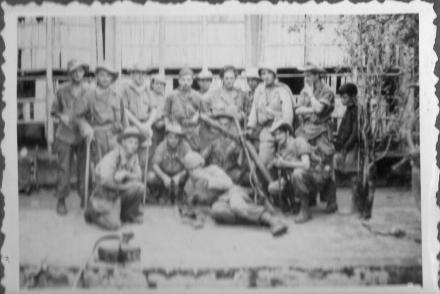 | | | Section Rassemblée après le combat On reconnait un Fusil Mitrailleur. un MAS 36 à crosse pliable , deux mortiers de 30 m/m , et un tromblon VB grenade à fusil au bout du fusil Contre le mur à gauche un PM Thomson .Le second parachutiste à partir de la gauche porte un PA Colt au ceinturon .Un porteur ou partisan participe à la photo. | | |