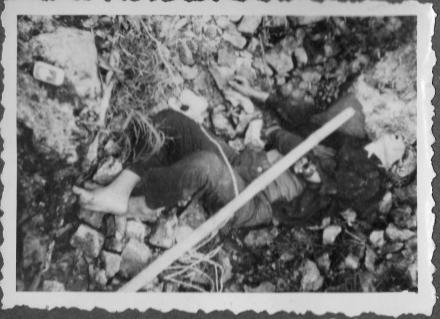Cependant que l' aumônier récite une dernière prière ,leurs camarades rendent les Honneurs Militaires à ces deux Chasseurs Parachutistes tombés au Champ d' Honneur .Cérémonial émouvant et plein de dignité que ces adieux , sur les lieux mèmes du combat entre compagnons d' armes ,entre PARACHUTISTES .Au fond nues tètes huit camarades de section qui porteront les brancards . Comment ne pas penser au chant de la 3: LES ANCIENS ONT SOUFFERT SUR LA PISTE COMME DES CHEVALIERS ET DES PREUX ... | | |