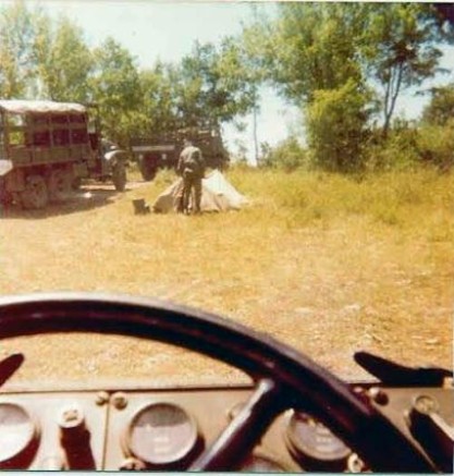 Des véhicules au parking après avoir transportés une compagnie sur le terrain. Un chauffeur monte sa tente en prévision de la nuit.