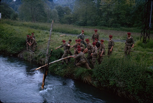 " A l' époque on enseignait au CNEC la manière de franchir une petite coupure avec des troncs d' arbres .Il semble que les pontonniers aient mal calculé la hauteur du dernier support en X .Dans un autre atelier les élèves pontonniers apprenaient a réaliser une sorte d' échelle à base de cordages et de traverses de bois sur lesquels ils posaient un tablier articulé fabriqué en troncs d' arbre .On distingue la proue d'un zodiac de sécurité cependant qu'un parachutiste parait en équilibre instable " En 1965 la mode était à la Défense Opérationnelle du Territoire et toute l' infanterie autre que celle du corps de Bataille Blindé Mécanisé se transformait en Infanterie dite Commando Une manière d'occuper des unités sous équipées en attendant de les doter de matériels modernes ..Les techniques de franchissement faisaient l'objet de recherches techniques et d'un entrainement intensif Il fallait qu' après l'intermède algérien l' Armée Française s' adapte à ses nouvelles missions en rapport avec le théâtre européen..