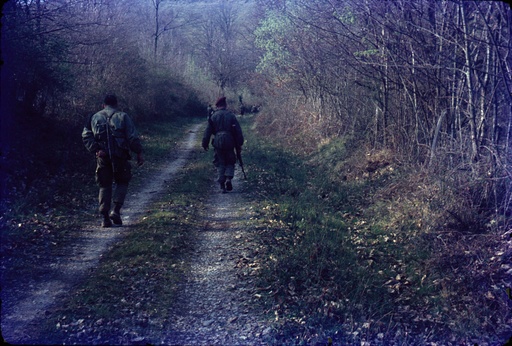 Sergent Chef Jean LAMARQUE , chef de Section en cours de progression , son radio porteur d'un ANPRC 10 à ses cotés .J.LAMARQUE est un vétéran d' ALGÉRIE décoré de la Médaille Militaire pour faits de guerre , quelques années plus tard il sera fait chevalier de la Légion d' Honneur .