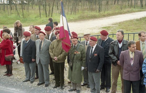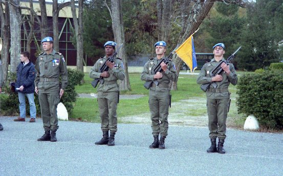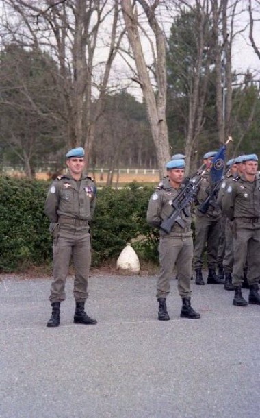 Pour la prise d' armes toutes les troupes sont coiffées du béret bleu de l' ONU . Il est pratiquement impossible de distinguer les paras du 1° RCP du 14°RPCS du 17°RGP du 6°RPIMa ou les fantassins du 41° RI . Les Fanions trahissent l'identité des Compagnies - quand les photos le permettent ! !