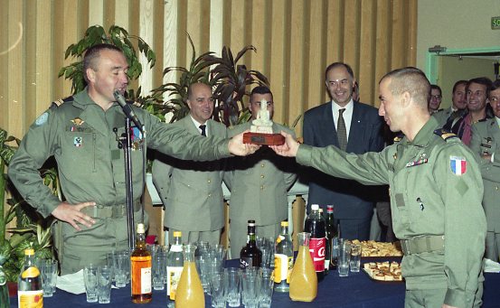 Le Général COM 11° DP félicite le Chef du B.F.ONU CAMBODGE pour le bon déroulement de la prise d' armes et du défilé. A l' issue du défilé le porte Fanion remet au Chef du BFIONU CAMBODGE