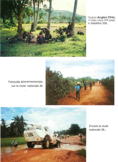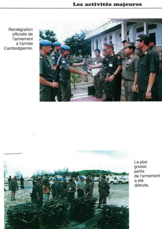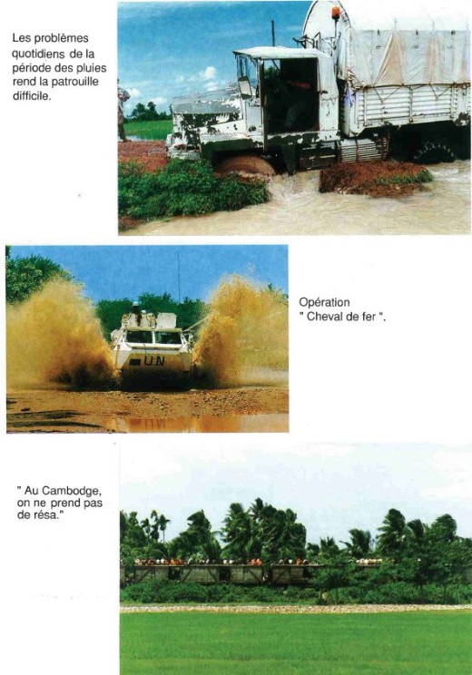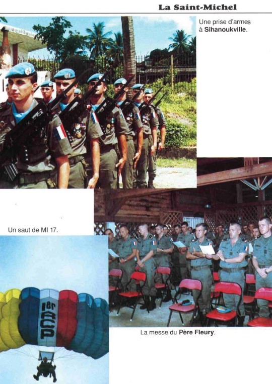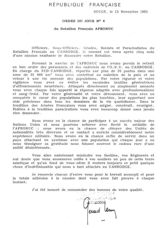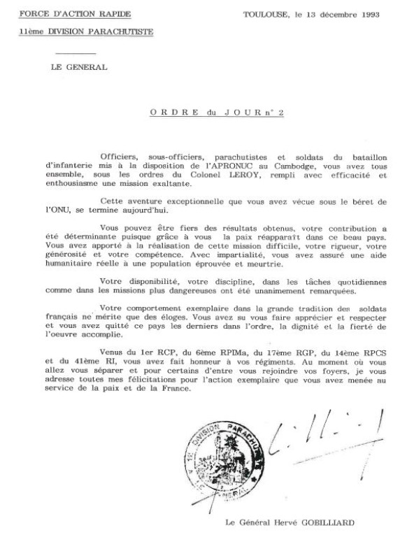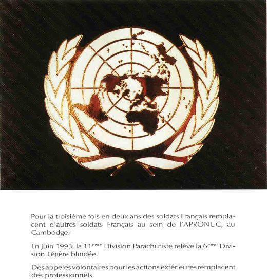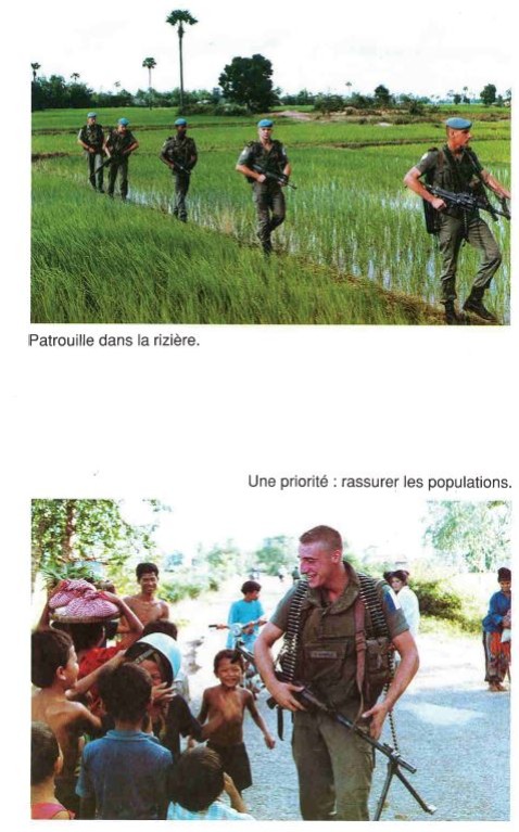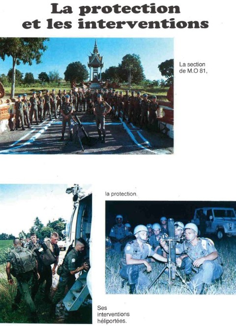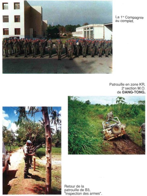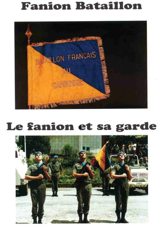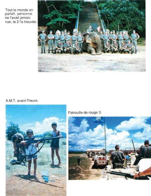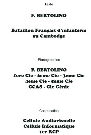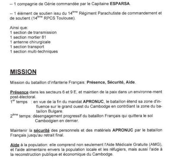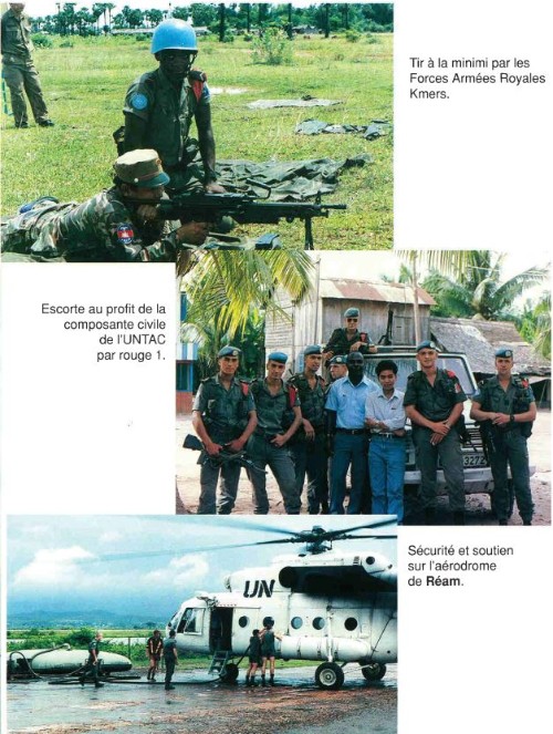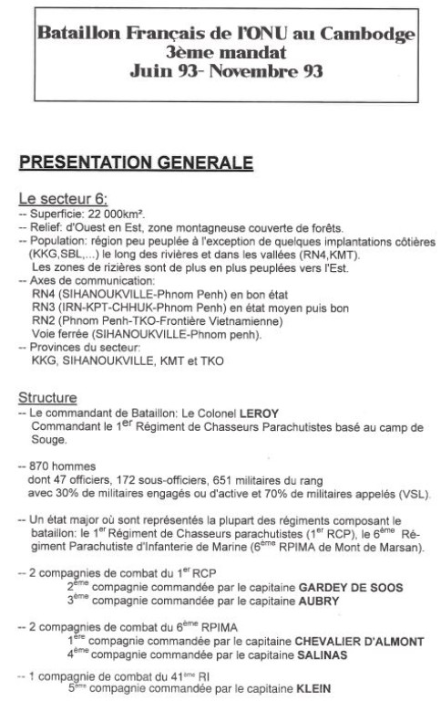 Bataillon d'Infanterie de l'ONU au Cambodge ( juin à novembre 1993 ) ► En juin 1993 le Chef de Corps du 1° R.C.P. prend le Commandement du B.F. O.N.U. au CAMBODGE . " Le 1°RCP fournit les 2° et 3° Compagnies " " Le 6° RPIMA fournit les 4° et 1° Compagnies " " Le 41° R.I. - ancien Régiment de la Reine - fournit la 5° Compagnie " " Le 17° RGP fournit la compagnie du Génie " " Le 14° RPCS fournit en majeure partie le soutien " Au retour du BF ONU une plaquette richement illustrée a été éditée .(1° trimestre 1994) A défaut de Journal de Marche cette plaquette présentera au lecteur le BF ONU au Cambodge. → SENS DE LECTURE des documents