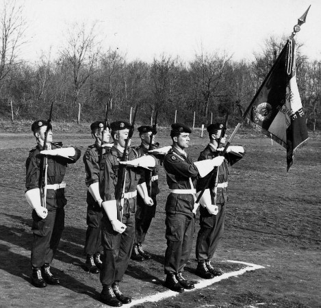 " Deux photos du C/C Jean Pierre BONNET du contingent 1963 /2C qui avec Michel BERNATETS faisait partie de la Cellule Information du 1° RCP .Travaillant tous les deux dans le mème laboratoire photo ,il est parfois difficile d' attribuer les clichés à l'un ou l' autre des deux photographes .Porter le pullover à même le corps , avec ou sans chemise , était un usage assez répandu dans les années 1960 " cliquez pour agrandir " Présentation au Drapeau du Contingent 1963 2/C Cette photo est prise au Camp de GER Le Lieutenant Porte Drapeau est décoré de la Légion d' Honneur Il se disait à l' époque qu'il avait été très grievement blessé en ALGERIE Photo prise de nuit à IDRON également pour Présentation au Drapeau et Fourragères du contingent 1963 2 C Porte Drapeau Lieutenant BOS Le Colonel VARENNES Chef de Corps salue le Drapeau "